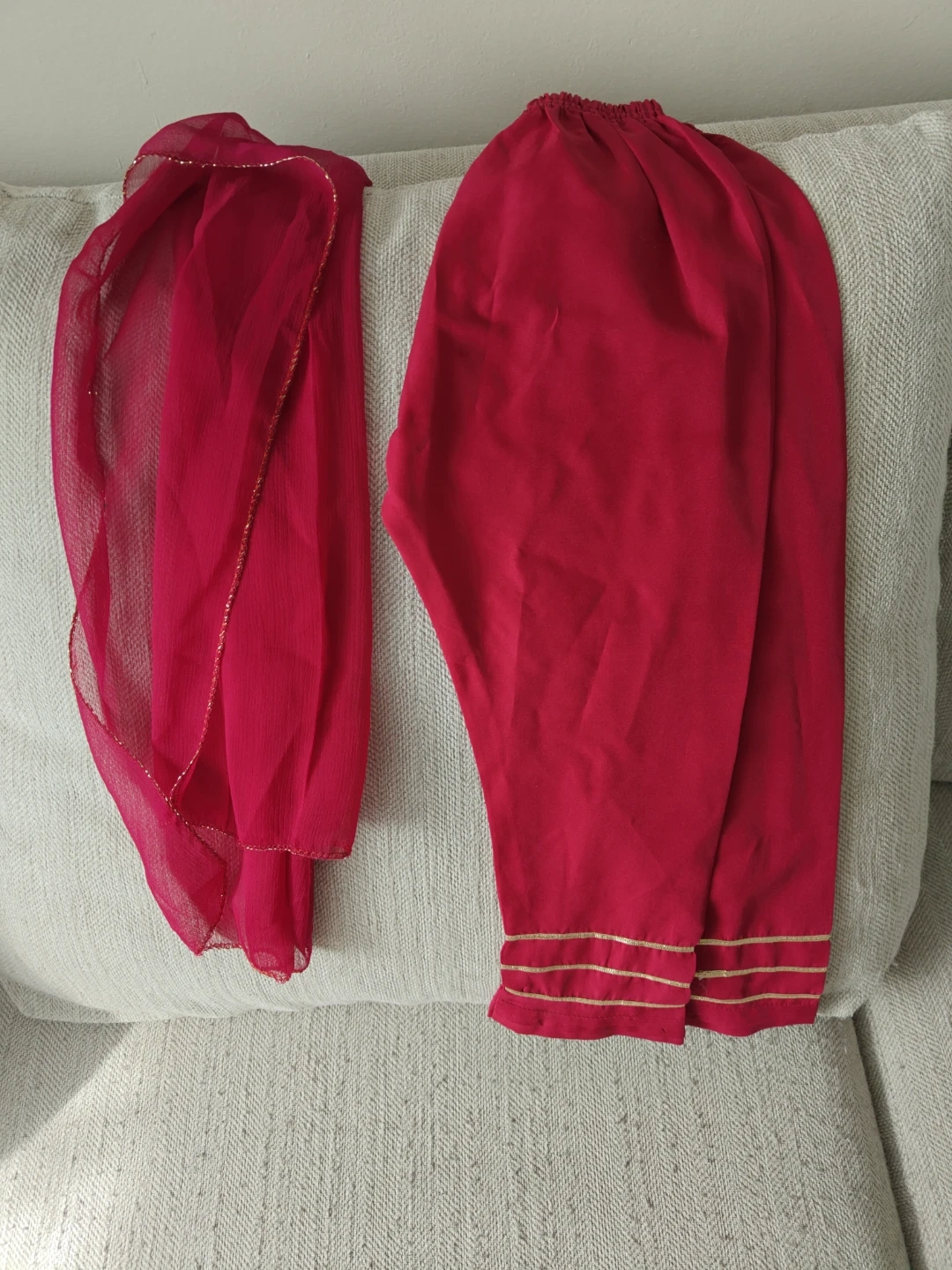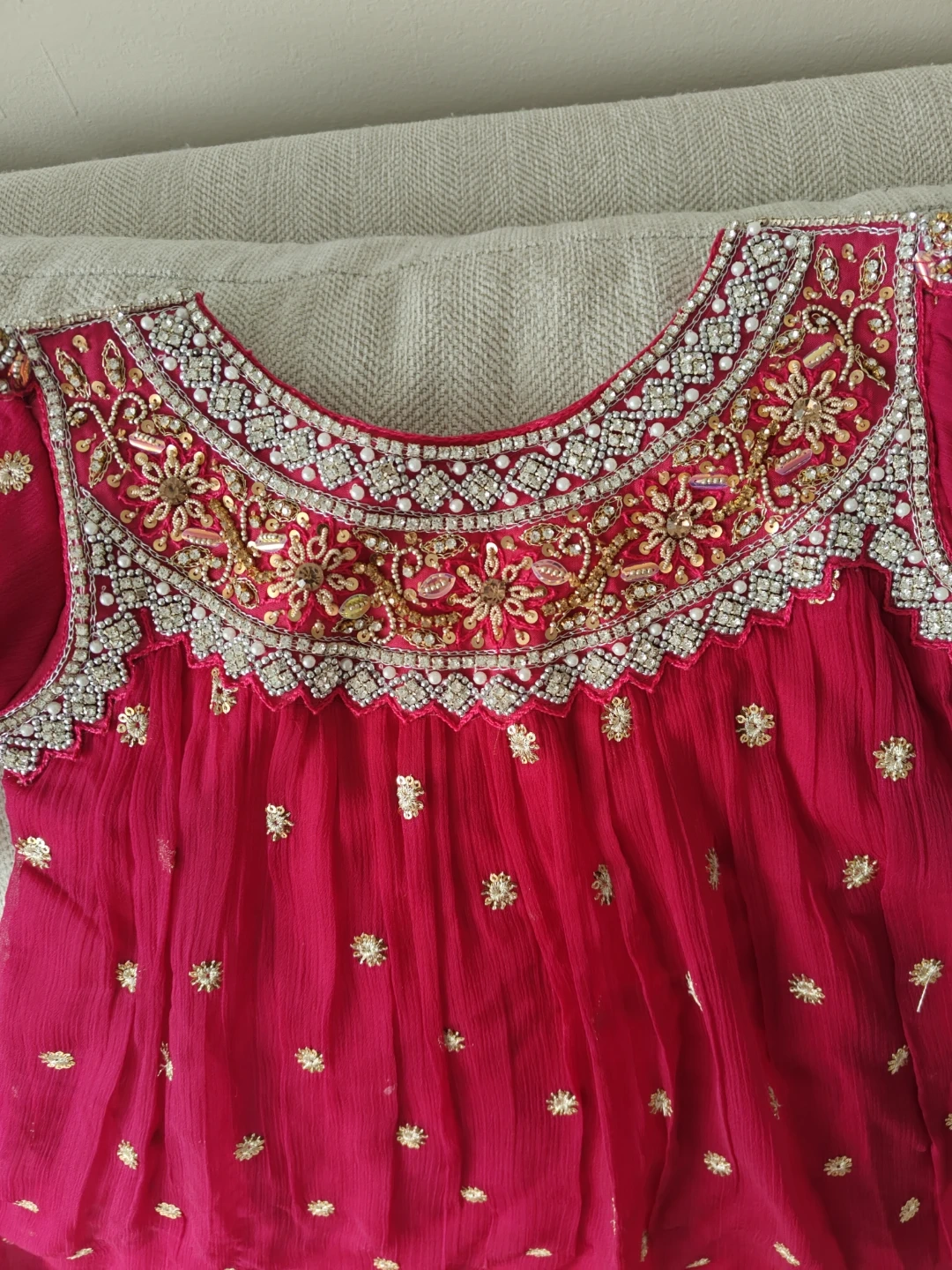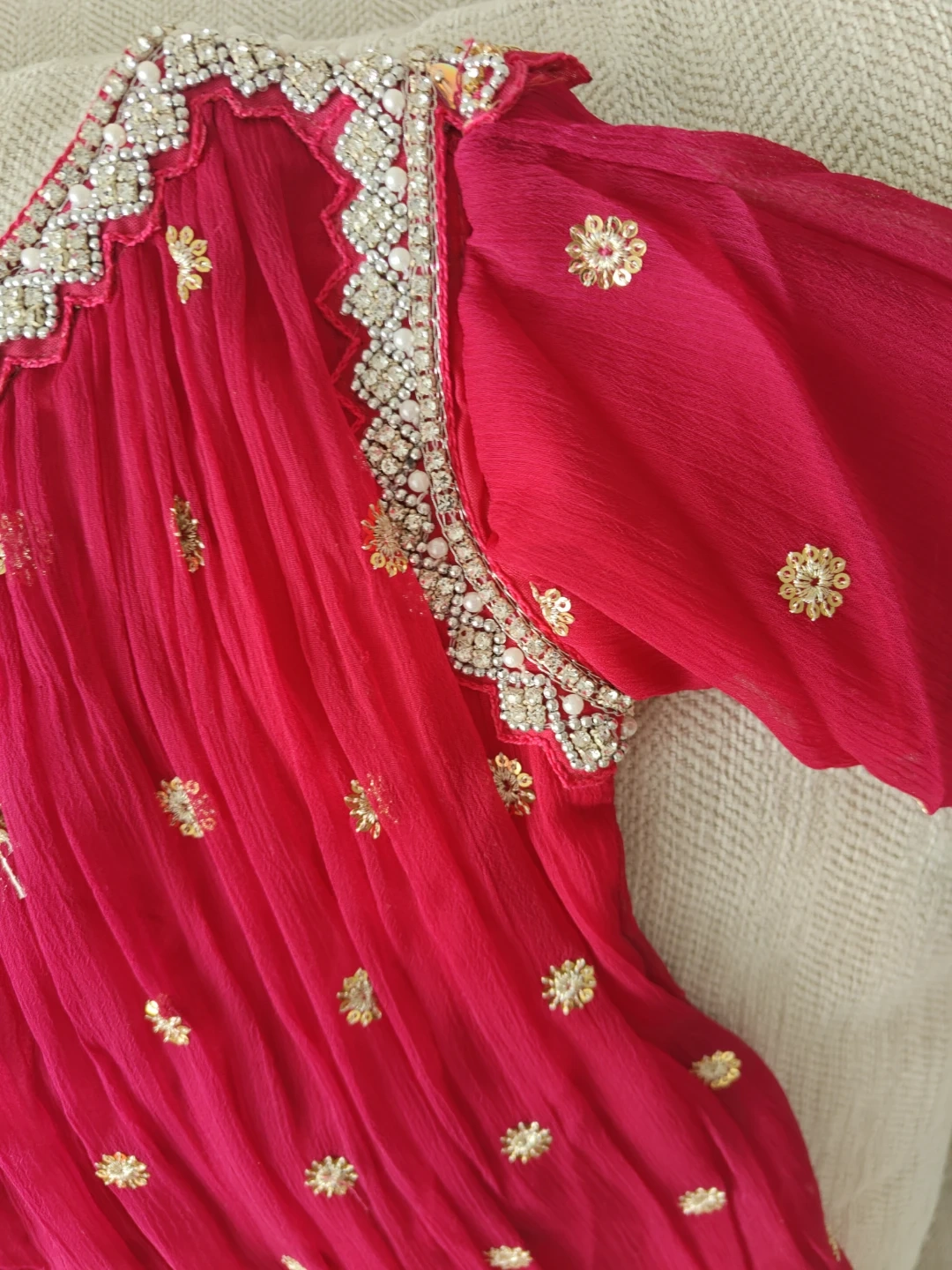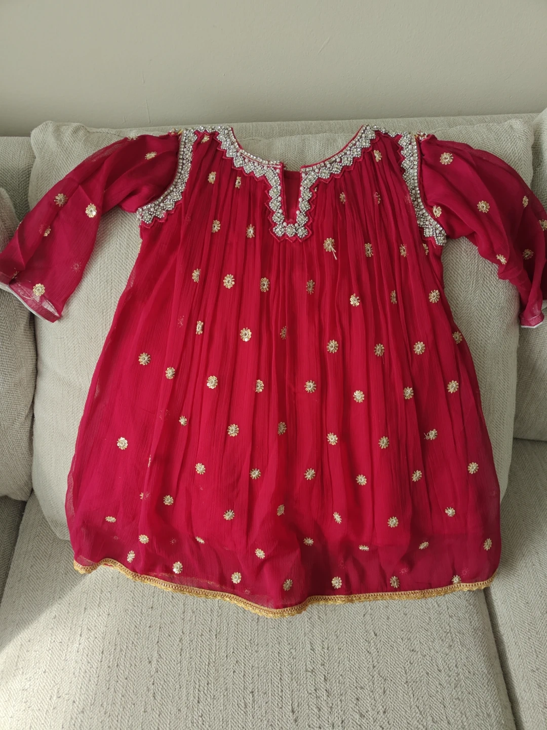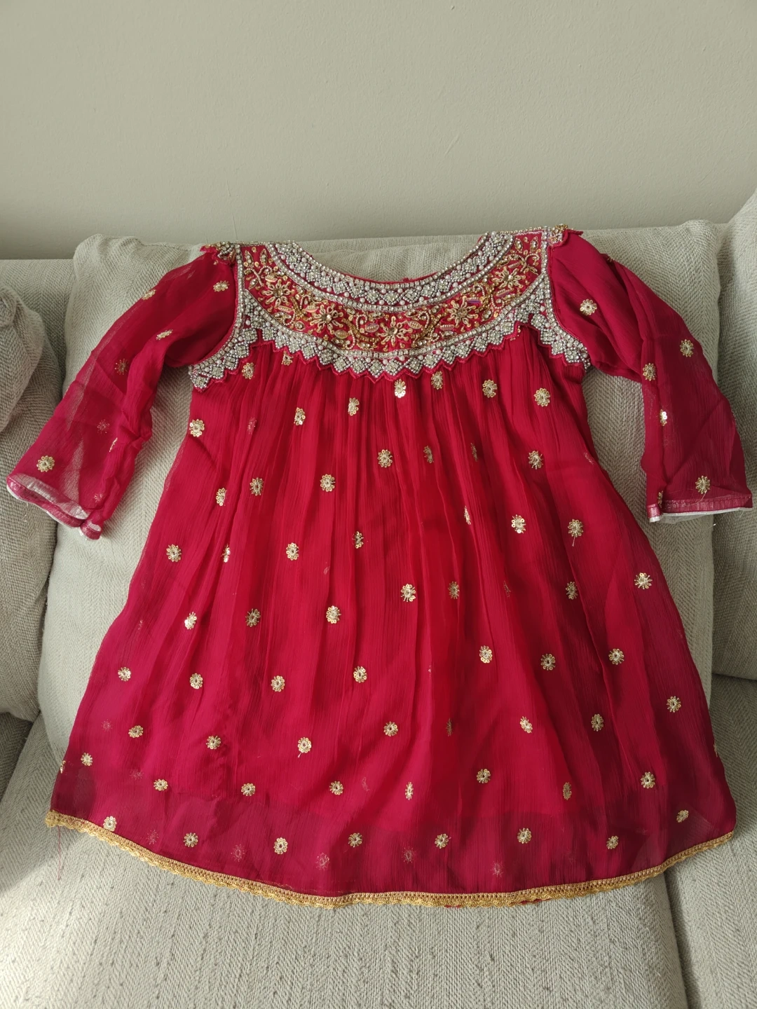 Bright red dress for a girl, adorned with gold floral embroidery and sparkling beadwork around the neckline. It features sheer sleeves and a flowy silhouette. This dress is perfect for special occasions or parties!