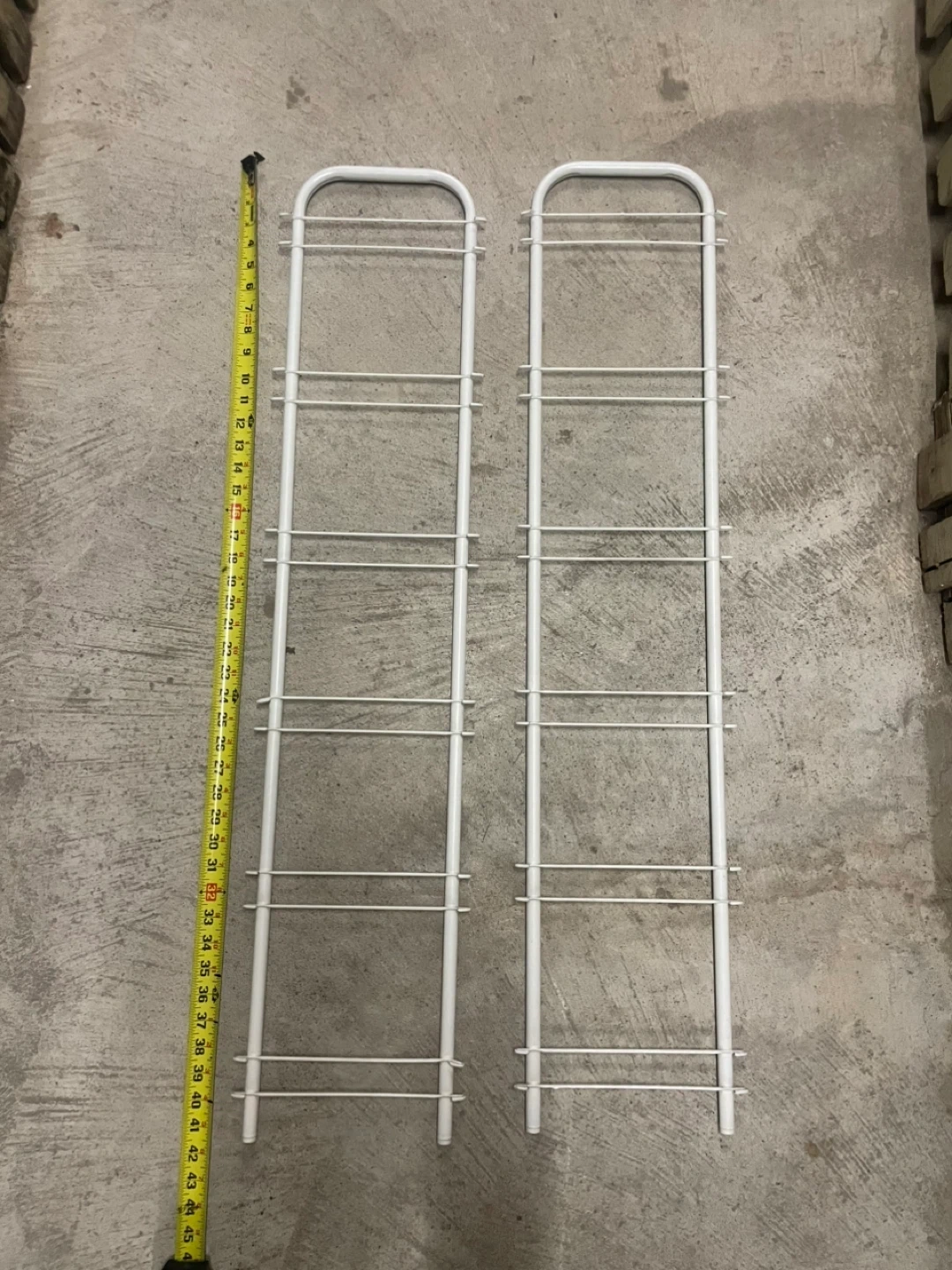 Set of five white wire shelf inserts. Includes two white wire shelf supports. Inserts measure approximately 21 inches by 15 inches. Supports are approximately 42 inches tall.