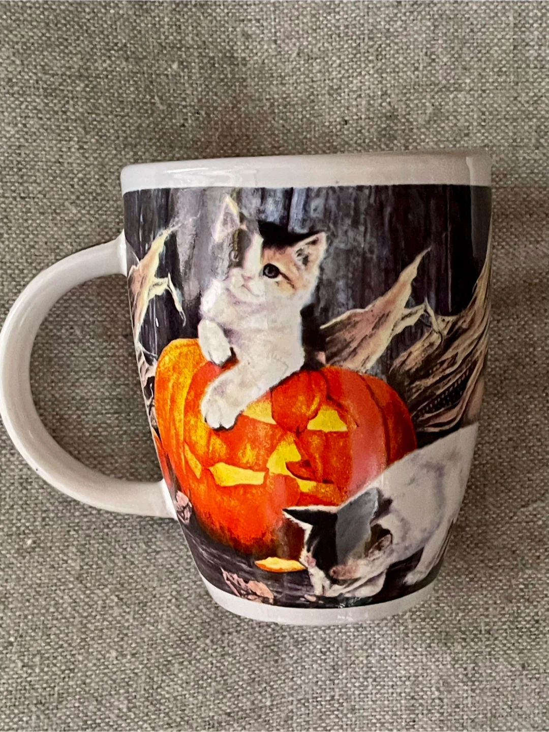 This festive mug features adorable kittens playing with a jack-o'-lantern. It's a great way to get into the Halloween spirit! Made of ceramic. Preowned in excellent, like new condition.