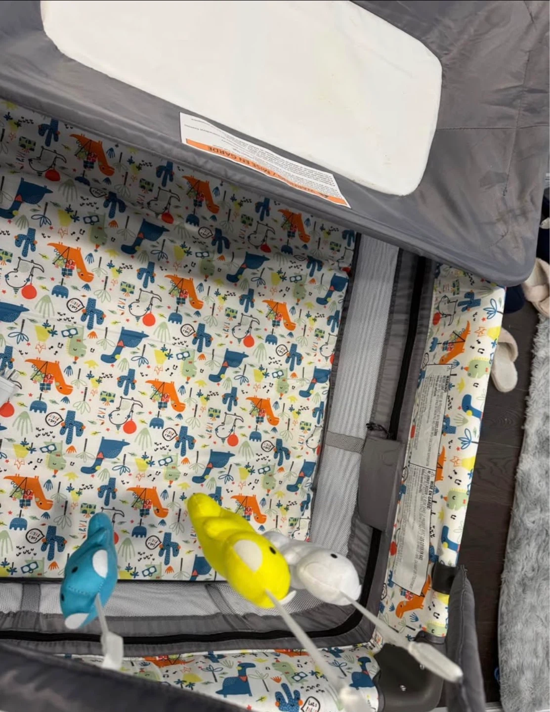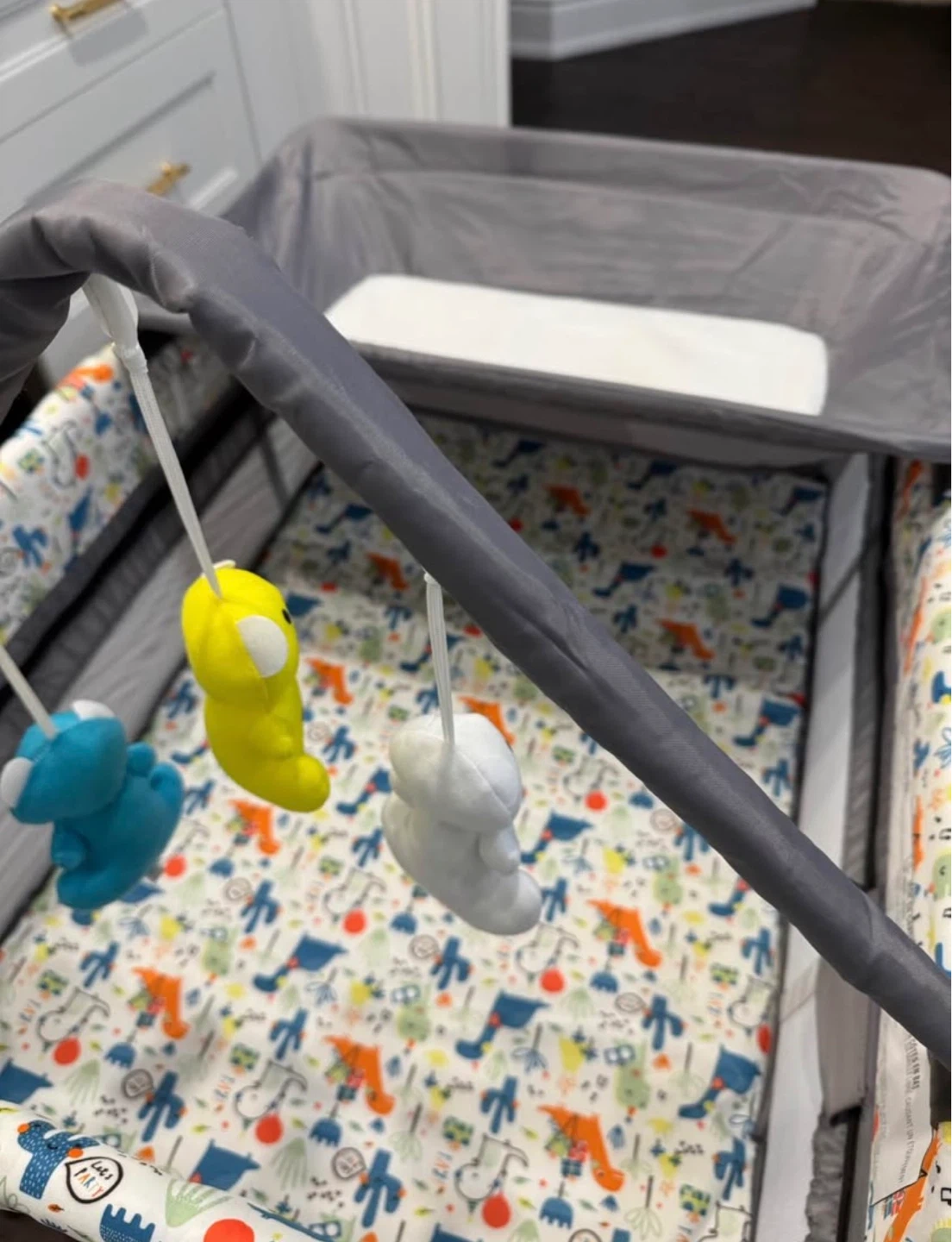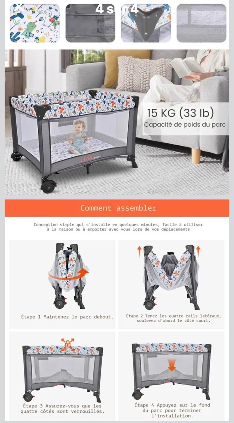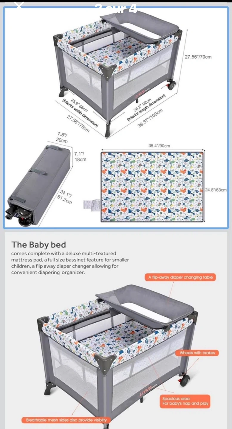 This playpen comes with a mattress pad and a flip-away diaper changing table. It has breathable mesh sides for visibility. It's great for baby's nap and play. It's suitable for children up to 15 kg (33 lb).
