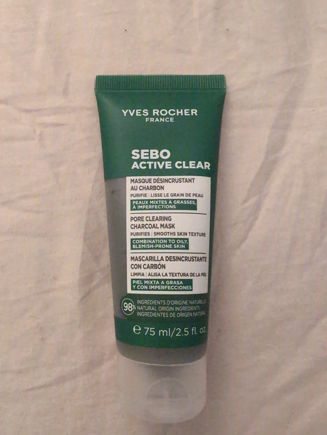 This is the Yves Rocher Sebo Active Clear Pore Clearing Charcoal Mask. It purifies and smoothes skin texture for combination to oily, blemish-prone skin. 98% natural origin ingredients are used. 75 ml / 2.5 fl. oz.