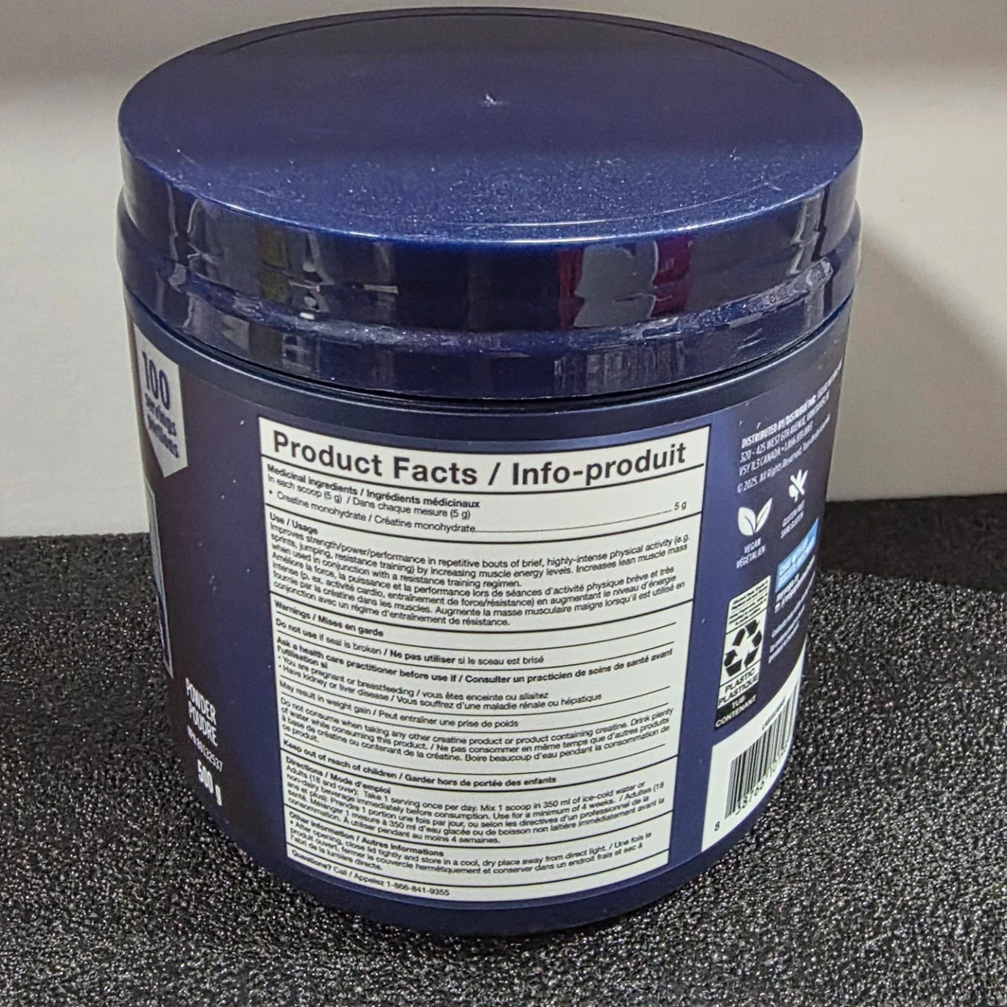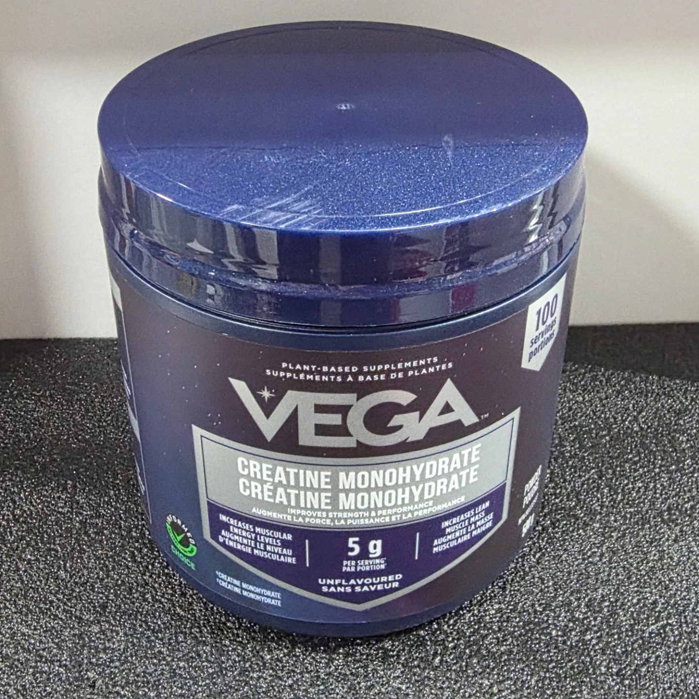 Vega Creatine Monohydrate unflavoured powder. Each serving contains 5 g of creatine monohydrate. This product is plant-based. 100 servings per container.