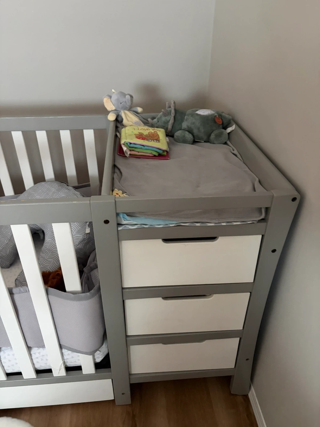 This convertible crib and changer set is grey and white. It includes a crib with railing guards and a changing station with three drawers. Great for a nursery!