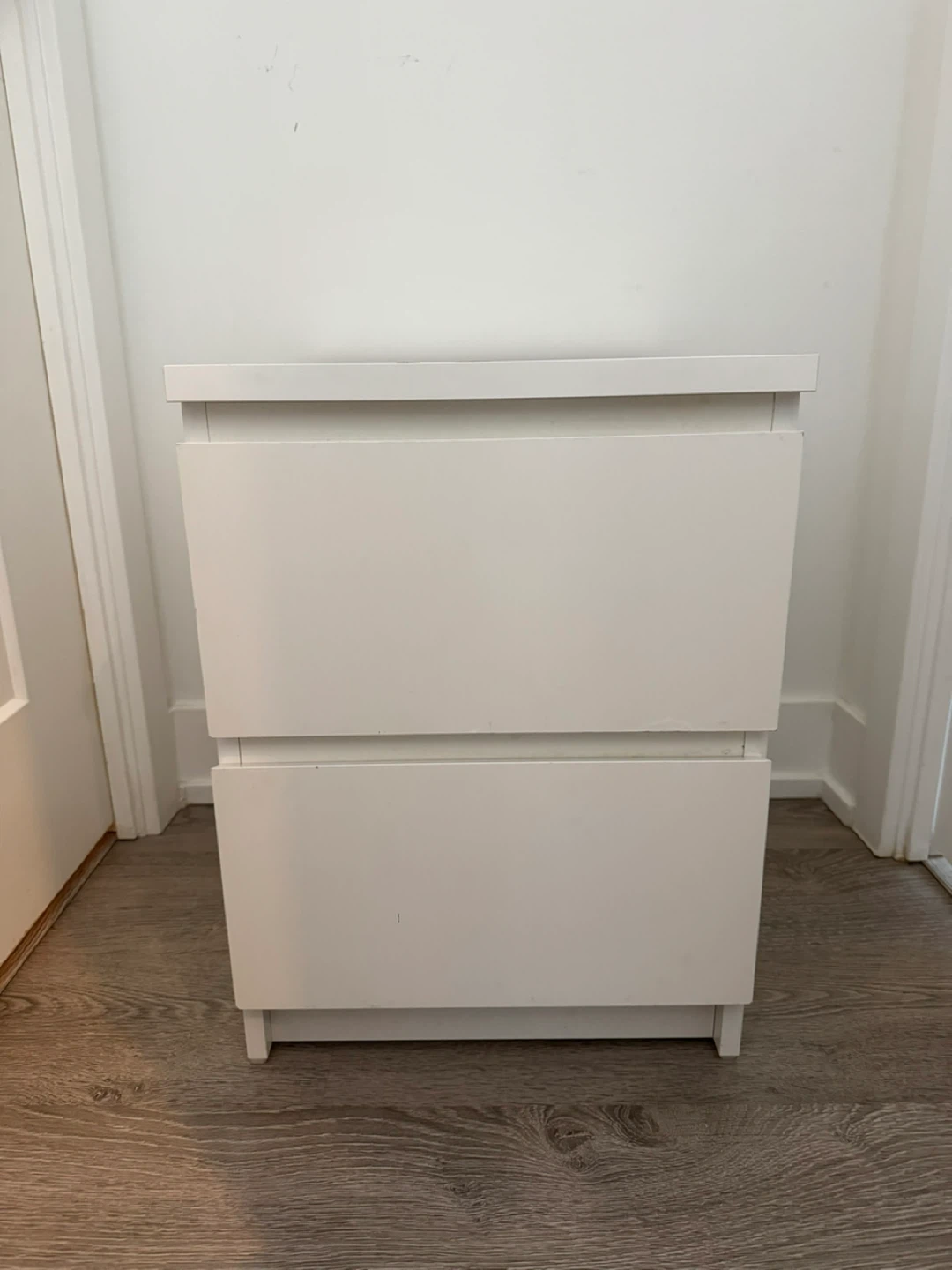 A white two-drawer nightstand. It's a simple and functional piece for your bedroom. This nightstand provides convenient storage space. Perfect for holding essentials for your bed!