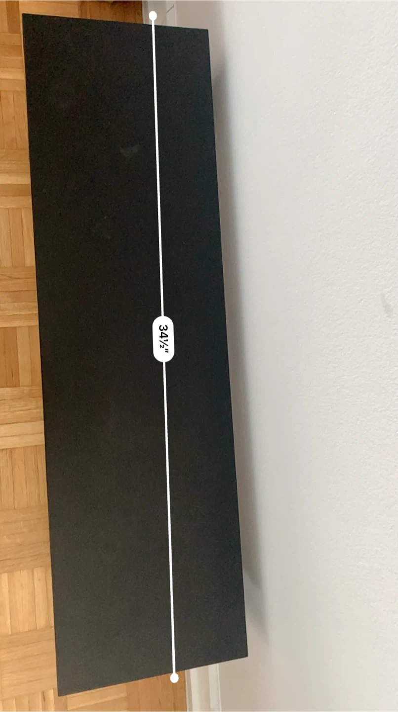 Black TV stand with an open shelf for storage. It measures 34 1/2 inches wide. This unit is made of particleboard with a black laminate finish. It's a good size for smaller living spaces.