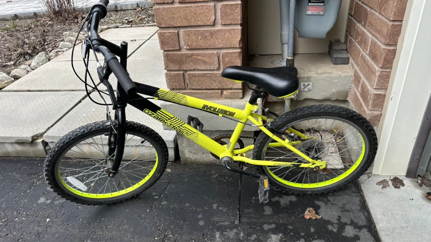 This is a bright yellow Ozark Trail "Evolution" kids' bike. It's perfect for young riders just getting started. Features include knobby tires for good traction.