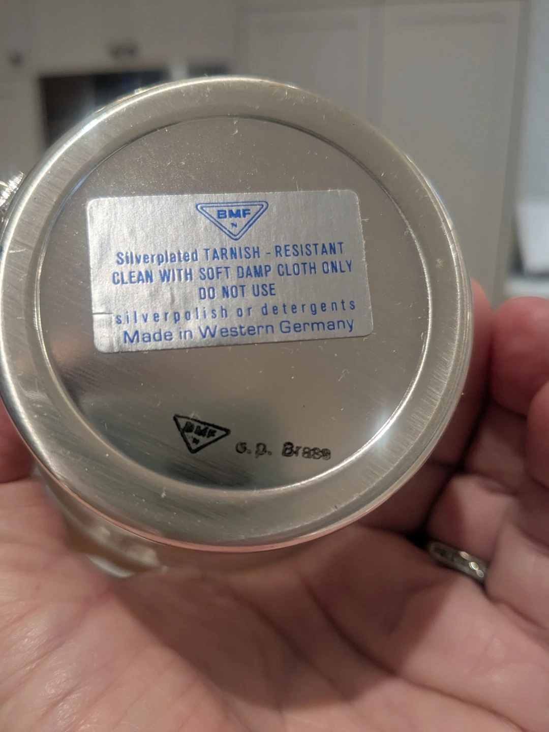Set of 12 BMF silverplated tea cups with matching saucers. Made in Western Germany. Base of cups are brass and covered with silver plate. Clean with soft damp cloth only.