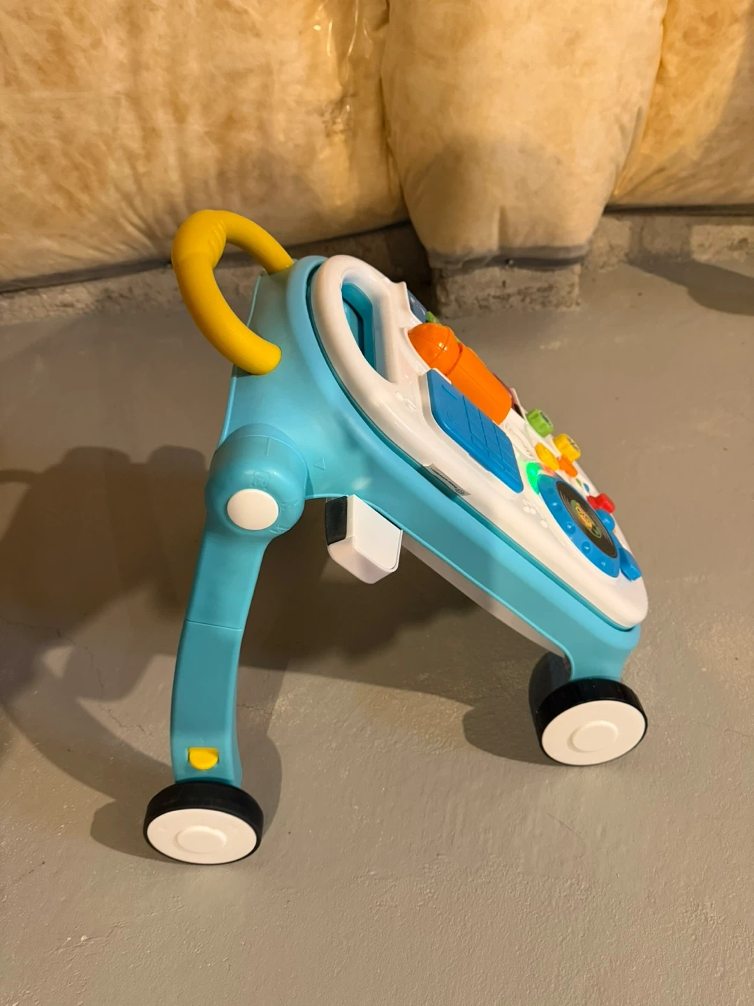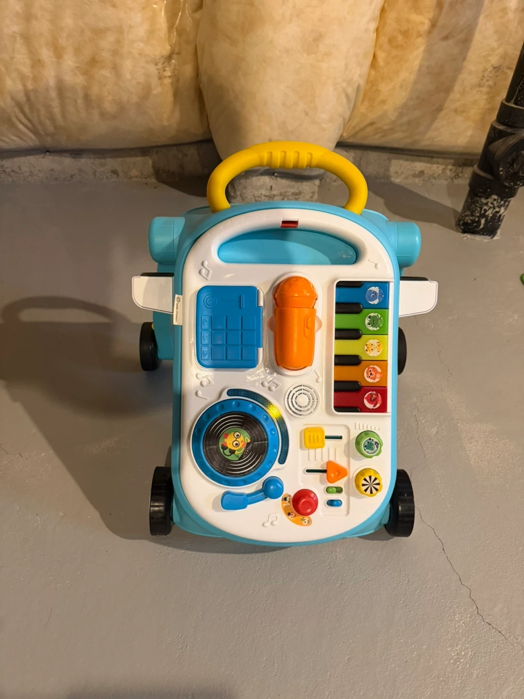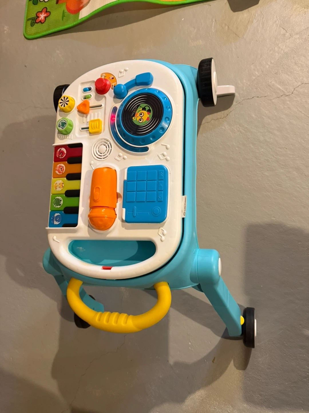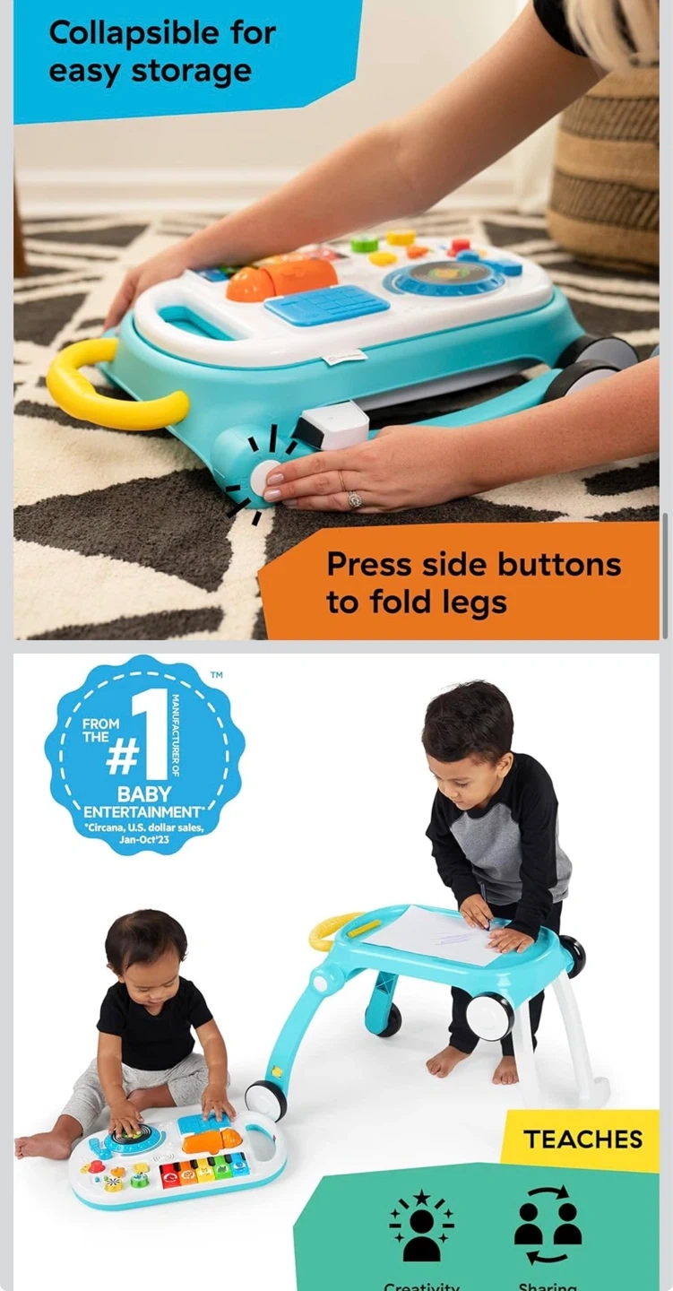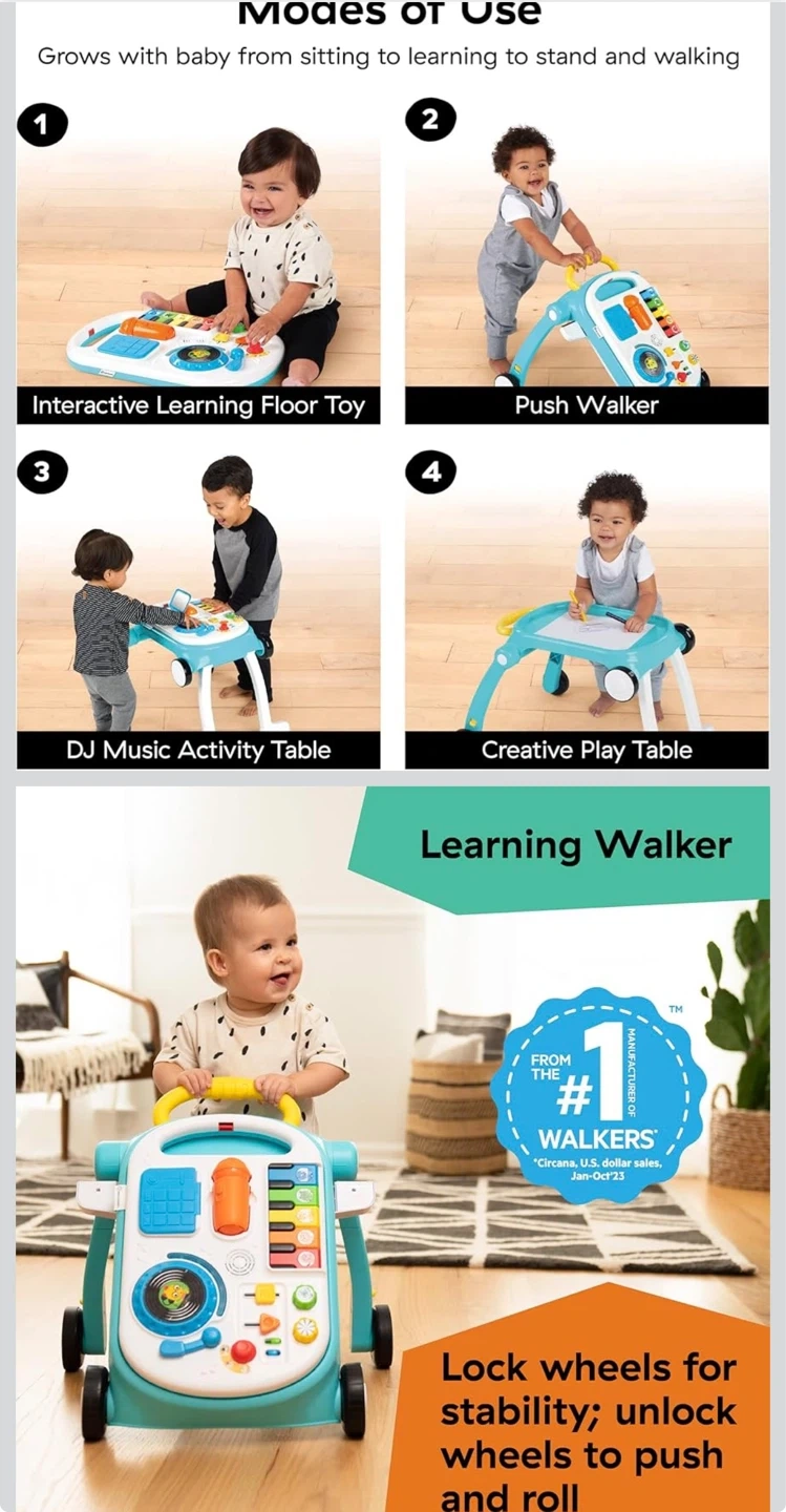 This is a Baby Einstein interactive learning floor toy that converts into a push walker. It has a DJ music activity table and creative play table modes. It grows with baby from sitting to standing to walking!