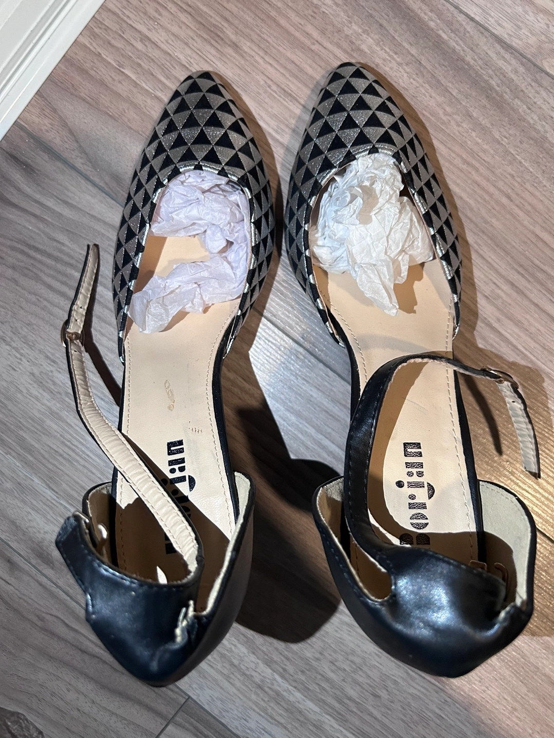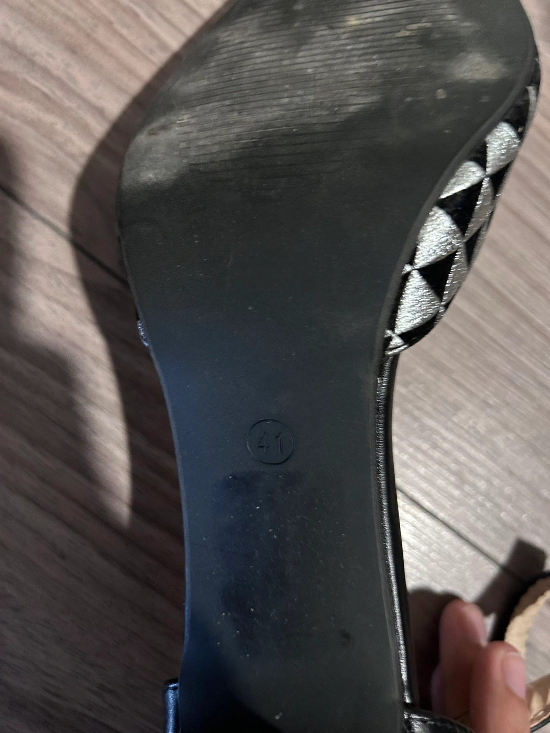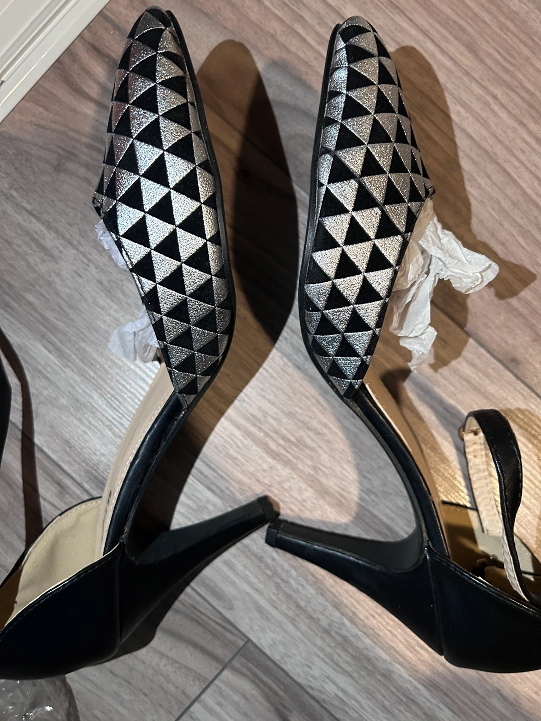 These are black and silver high heels with an ankle strap. They have a geometric pattern and are a size 41. Great for formal wear. Brand new and price is negotiable.