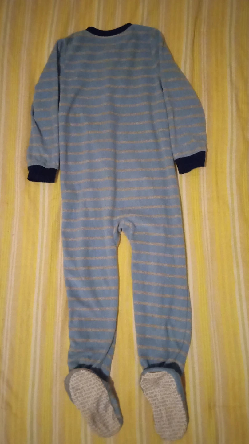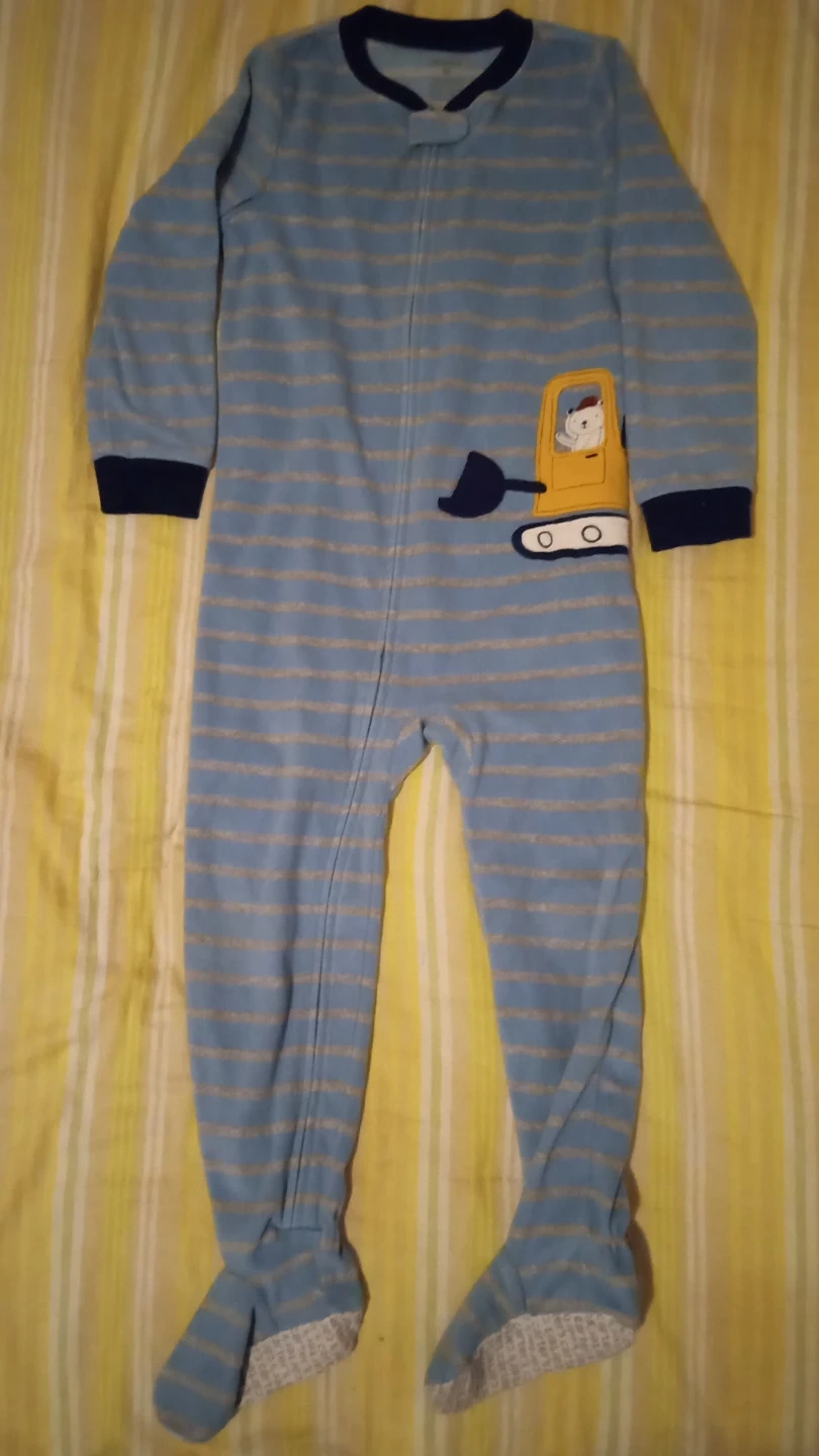 Blue striped footed pajamas with an excavator graphic. They're made of flame-resistant material and feature non-slip grips on the soles. Perfect for keeping little ones cozy and safe at bedtime!