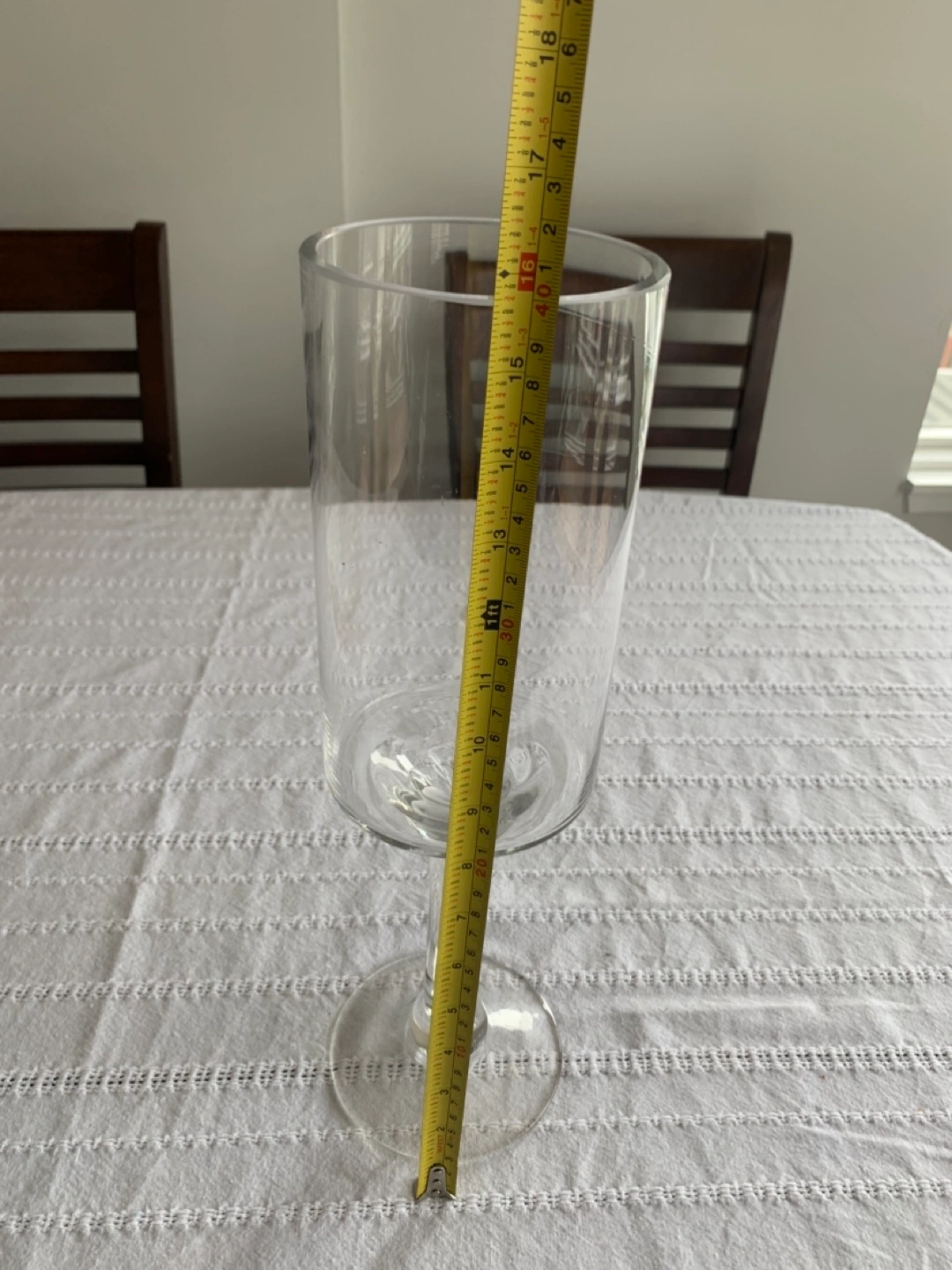Tall clear glass vase or holder. Perfect for floral arrangements or decorative purposes. Measures approximately 18 inches tall. Sturdy base.
