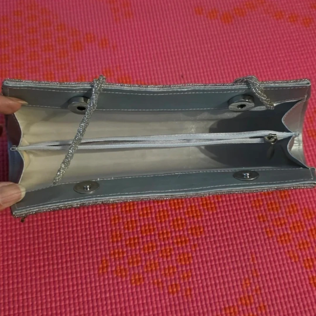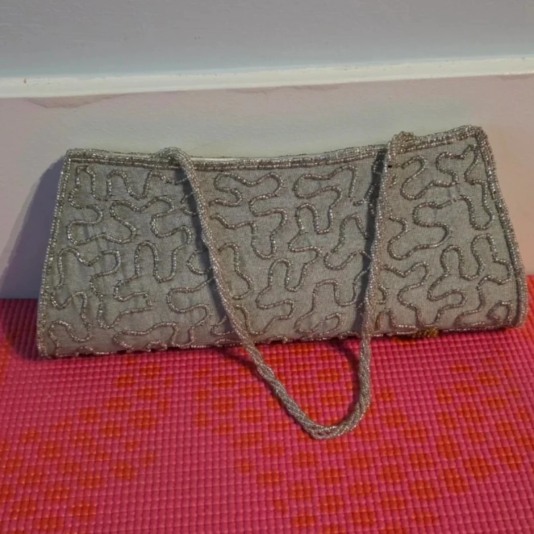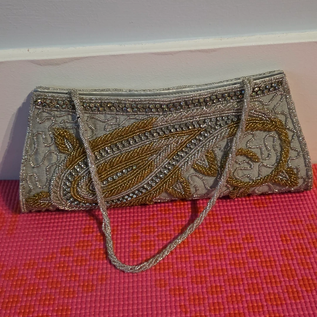 This beaded clutch purse is silver and gold with ornate detailing. Measurements in pictures. It's perfect for special occasions or an evening out! Also, it will go really well with south asian dresses.