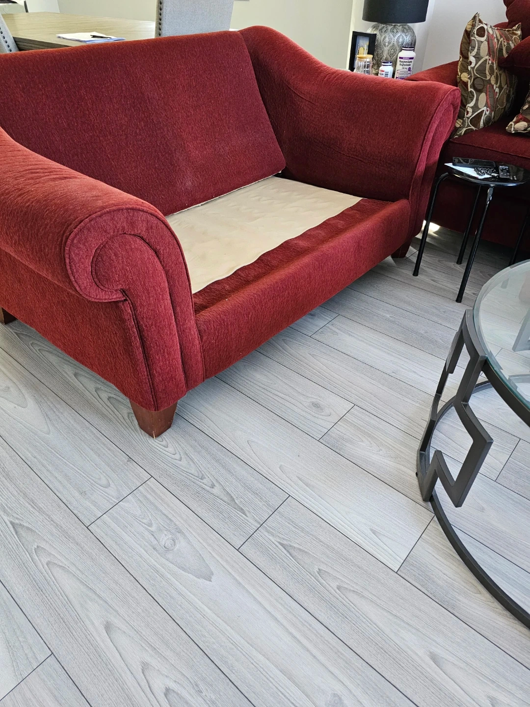 A comfortable red loveseat sofa. It has a textured fabric upholstery and plush cushions. This sofa is a good size for smaller living spaces or apartments.