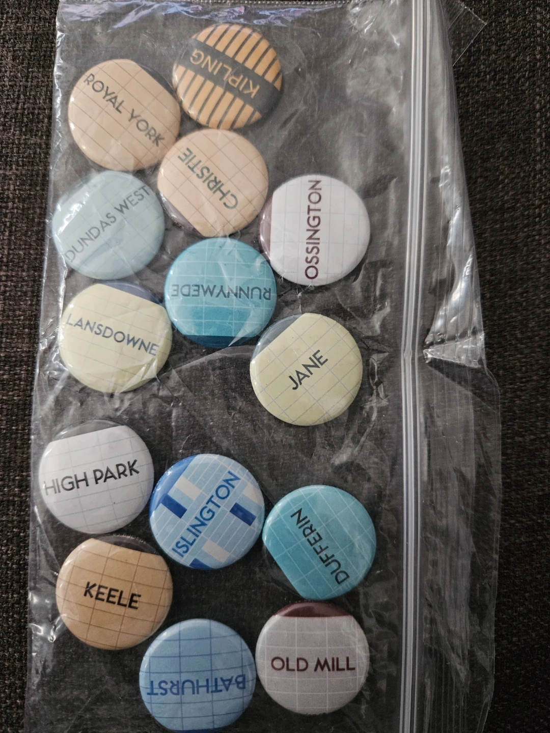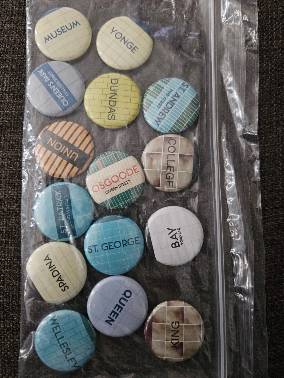 This set includes 62 one-inch buttons/pins containing stations in the system, but does not include the newer Downsview extension and Finch Line stations.
