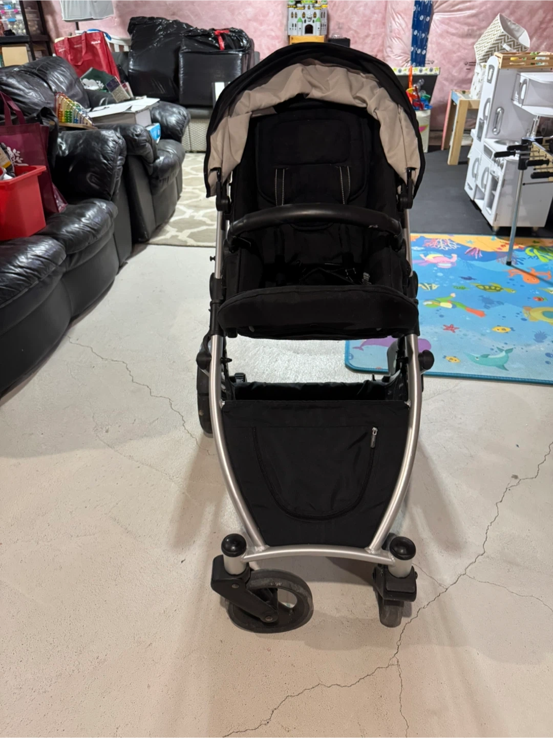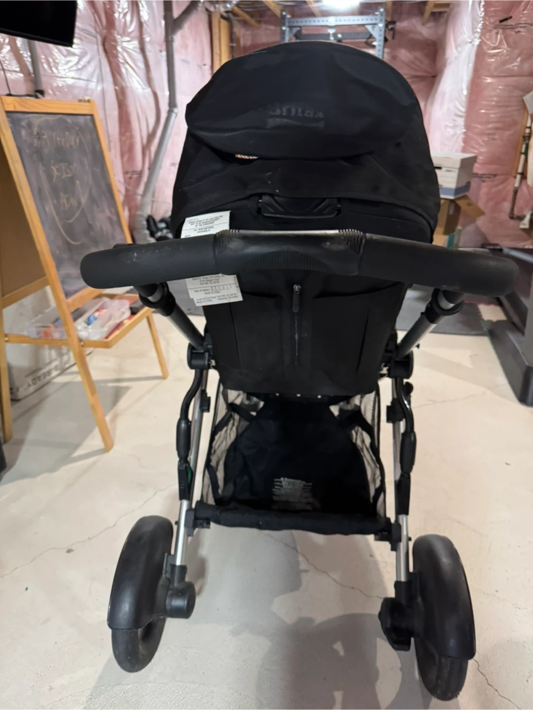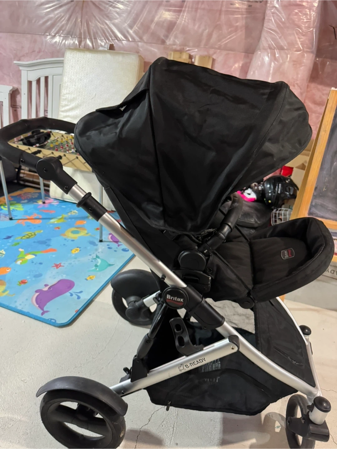Black Britax B-Ready stroller with a large storage basket. It's a versatile stroller with a reversible seat and adjustable handle. Perfect for navigating city streets or park paths!