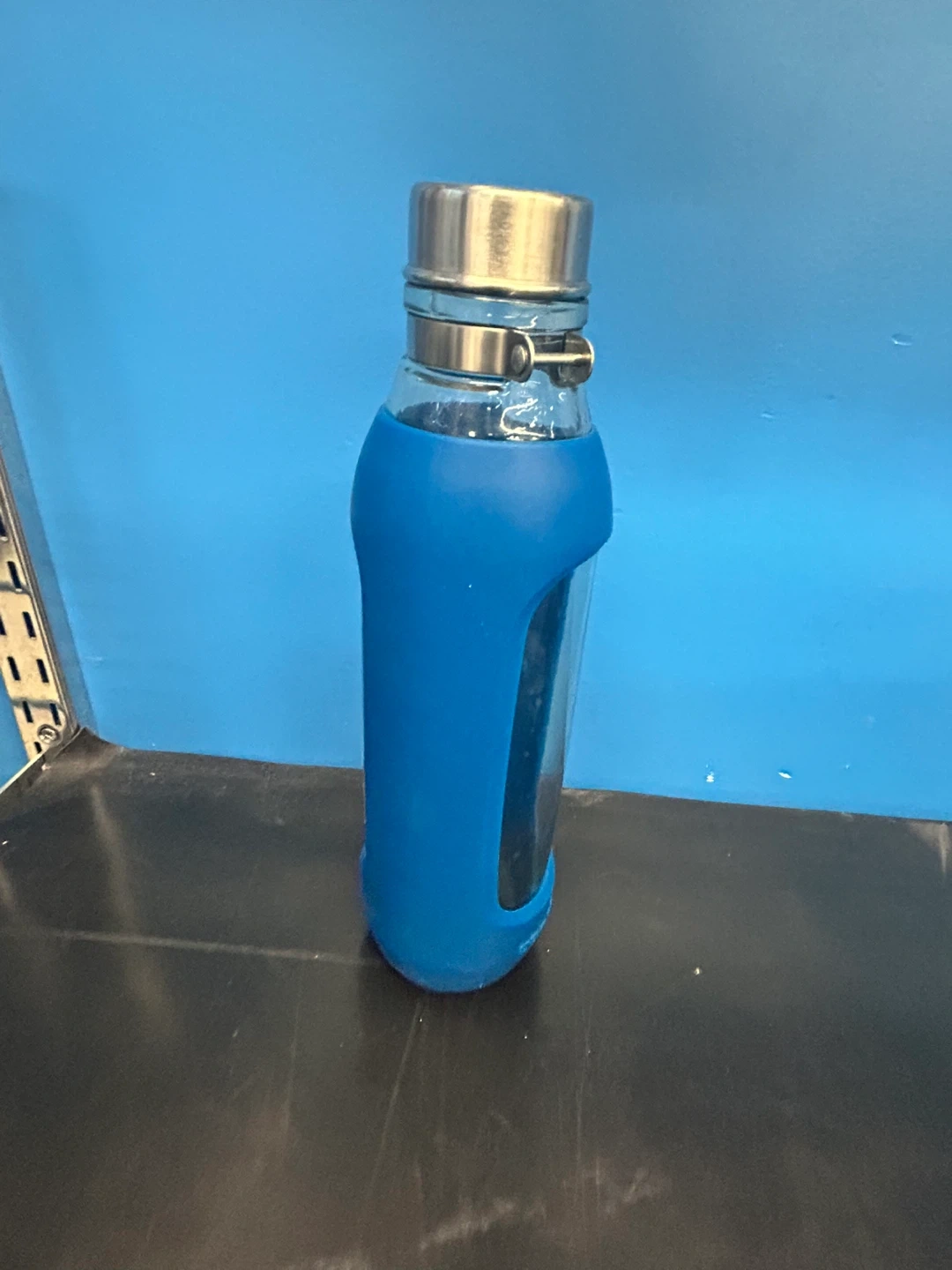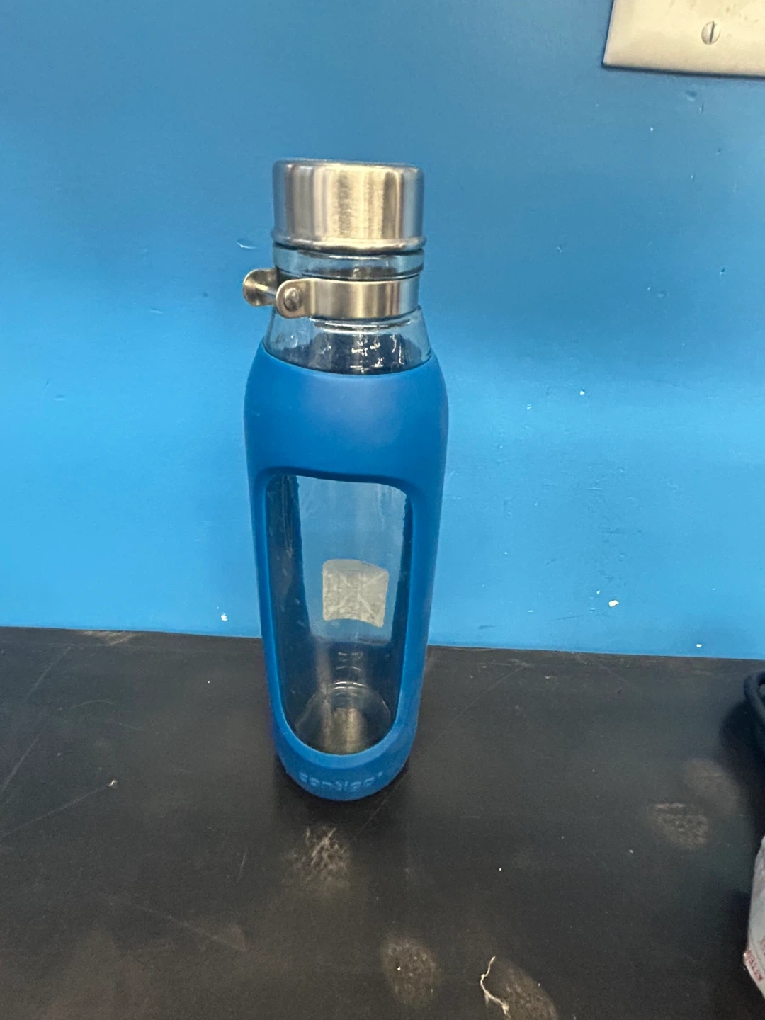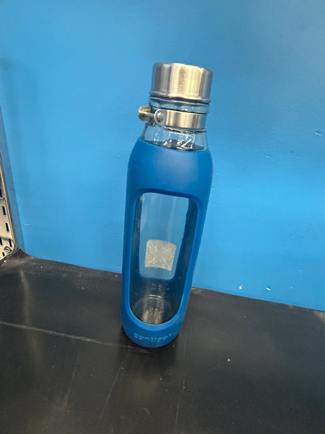 Glass water bottle with a blue silicone sleeve. It's made by Contigo. Stainless steel cap with a clamp closure.