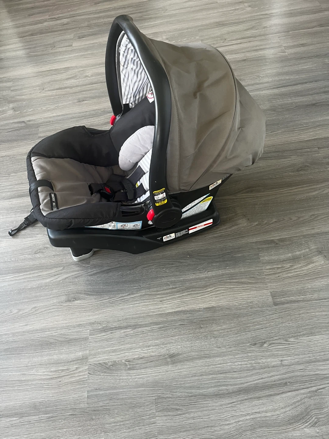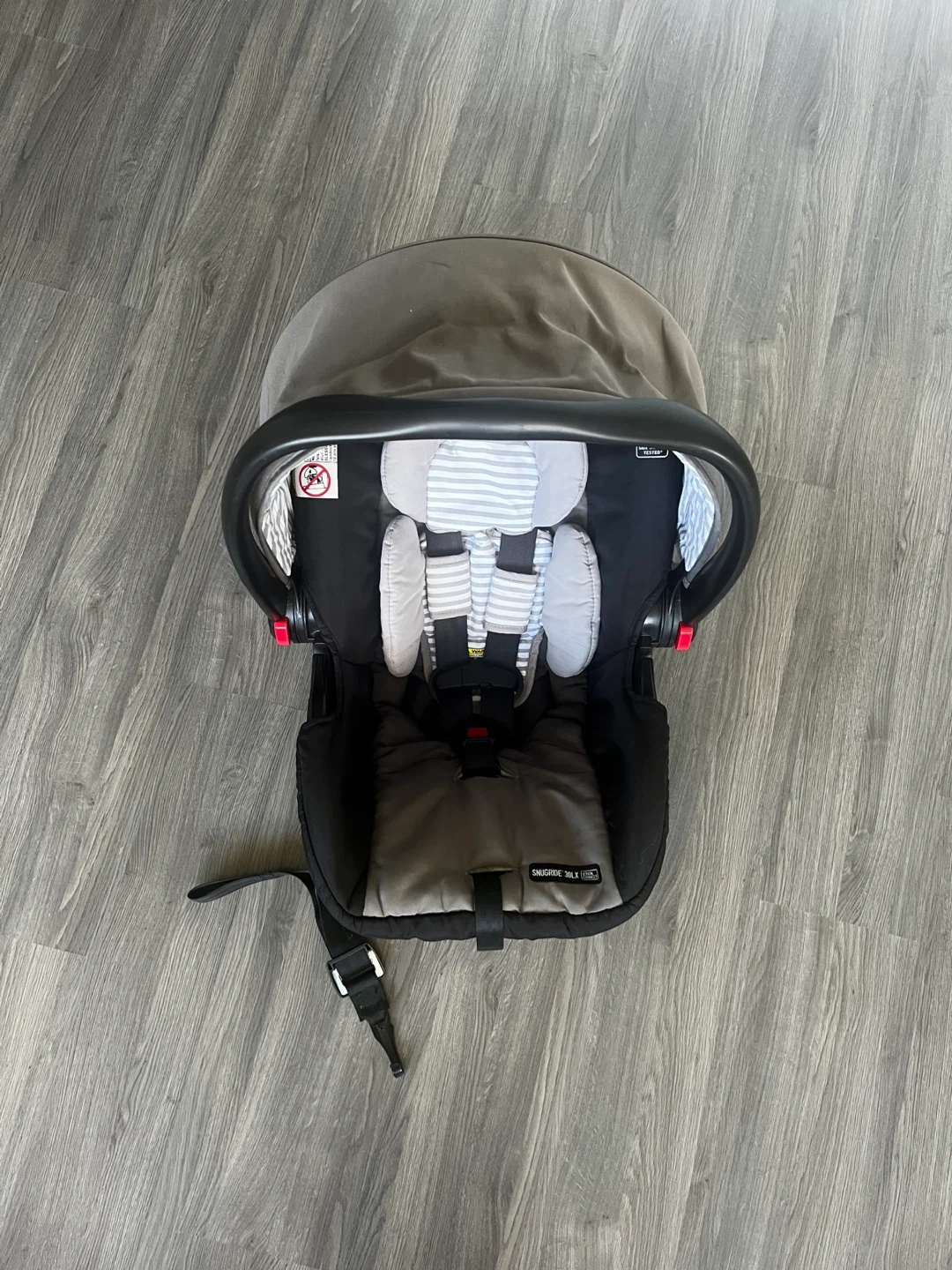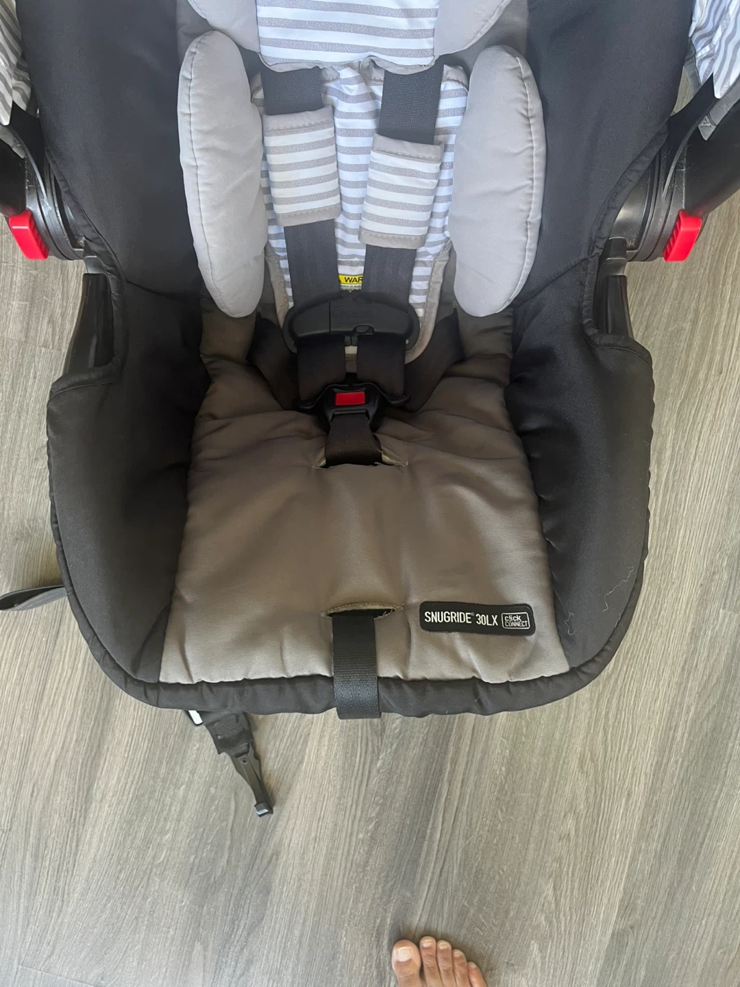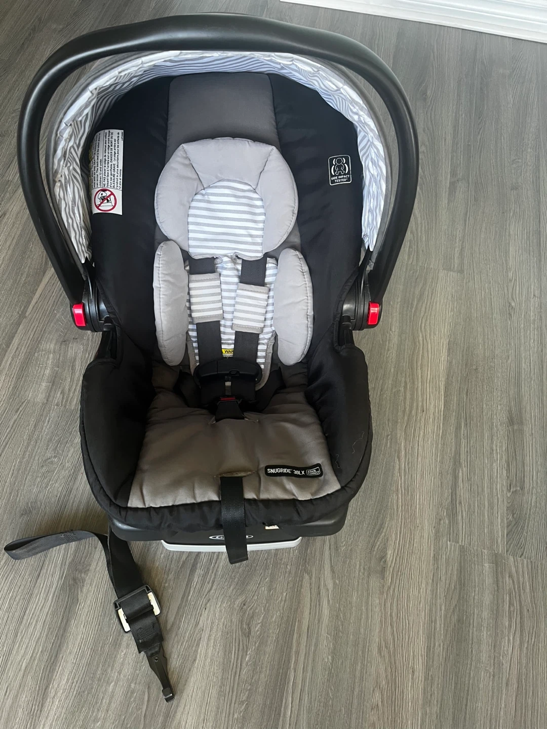 This Graco SnugRide 30LX infant car seat comes in black and grey with white and grey striped accents. It features a 5-point harness for safety. It's designed for infants.
