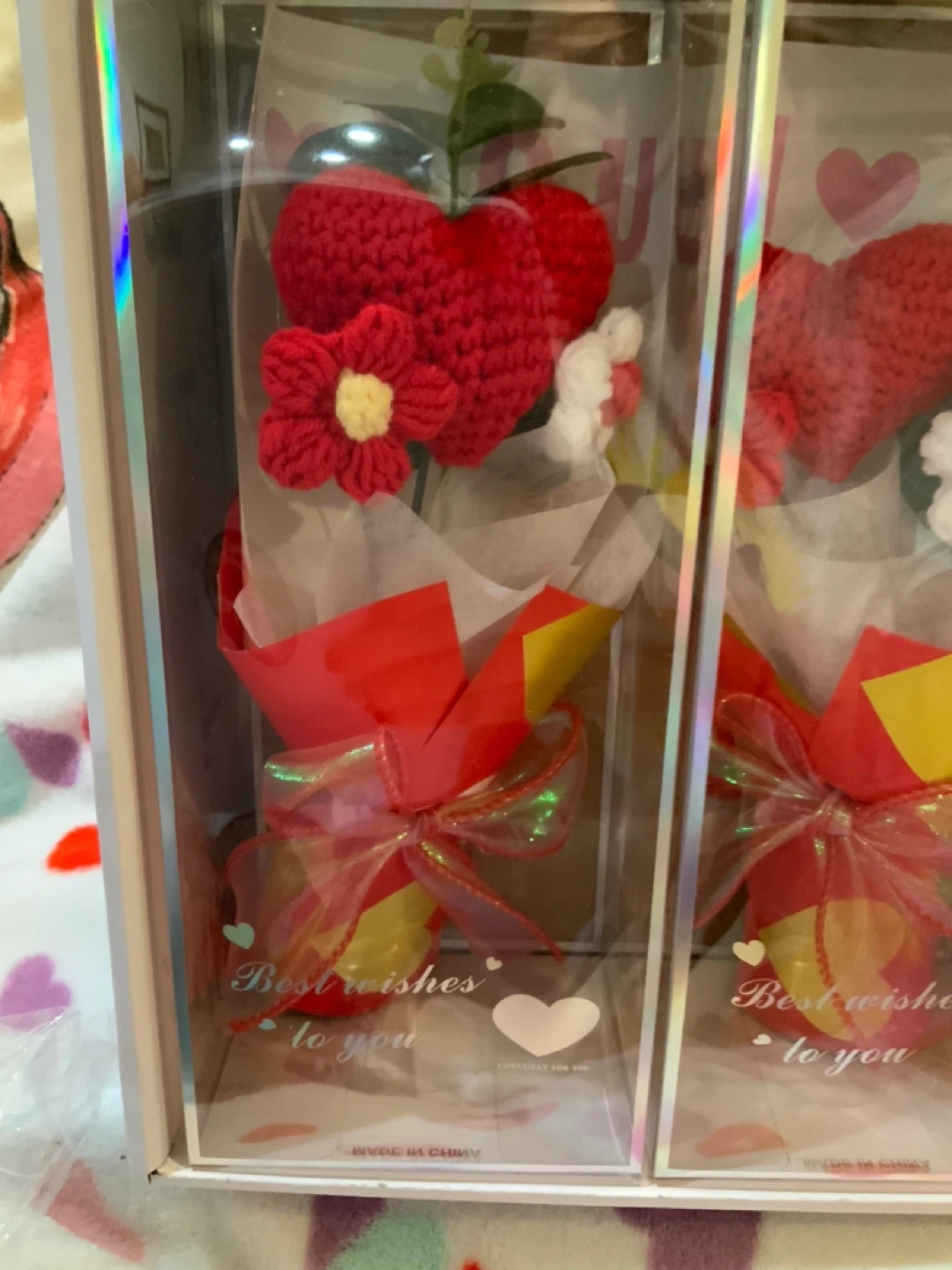 This is a cute crocheted flower bouquet presented in a clear gift box. It features red and white crocheted flowers with green leaves and some dried filler. The bouquet is tied with a red ribbon and bow. It's ready for gifting! $10 each
