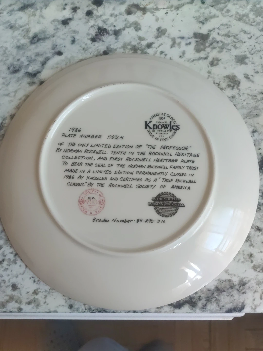 This is a limited edition collector's plate from 1986, featuring Norman Rockwell's artwork "The Professor". It's part of the Rockwell Heritage Collection and the first Rockwell Heritage plate to bear the seal of the Norman Rockwell Family Trust. Made in a limited edition permanently closed by Knowles. It's certified as a true Rockwell classic by the Rockwell Society of America!