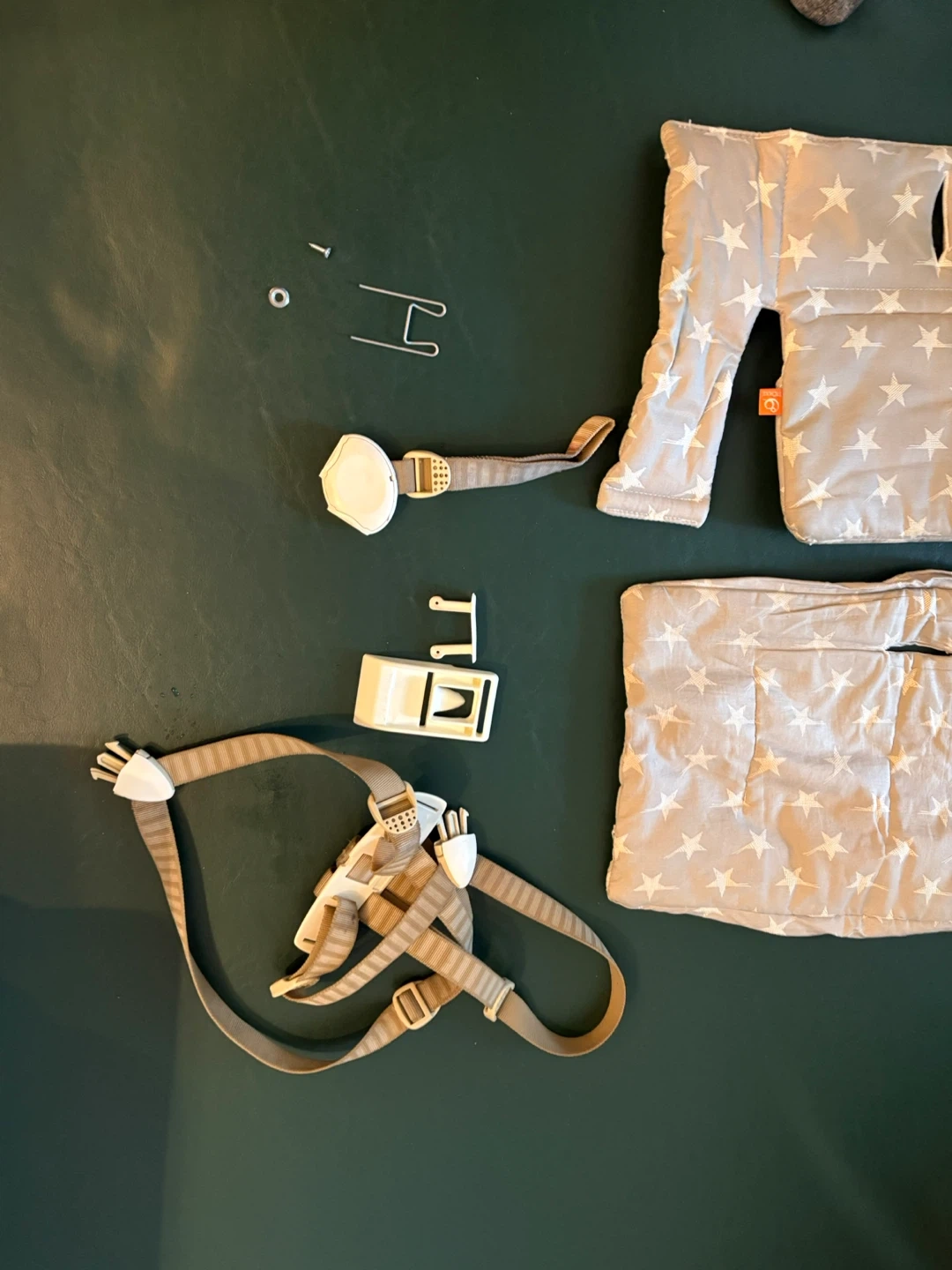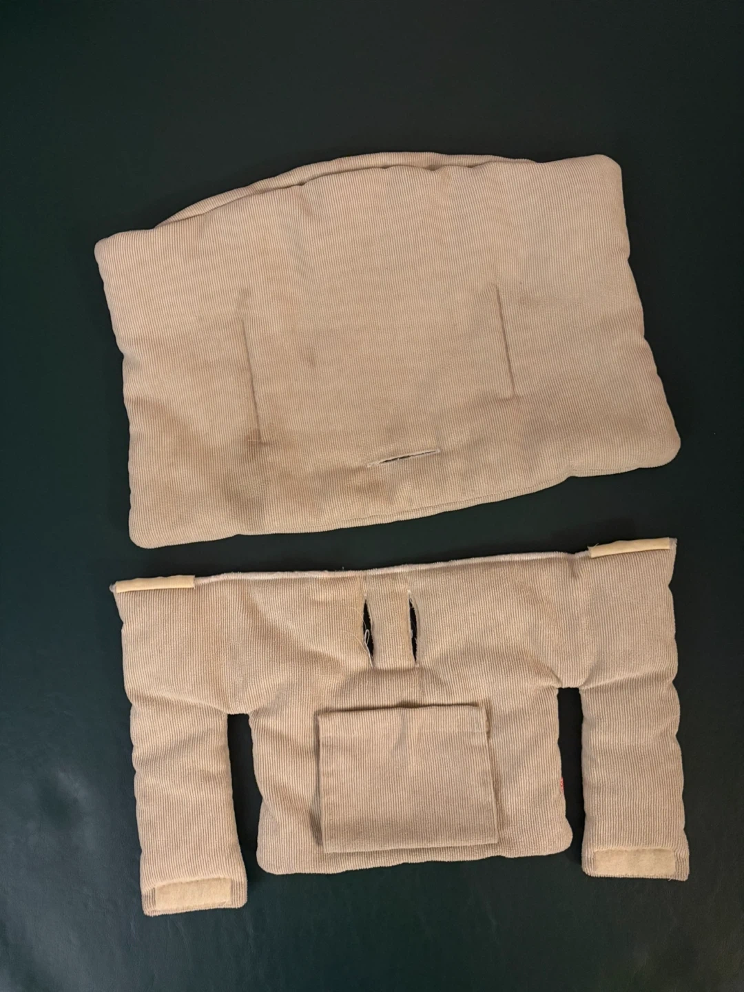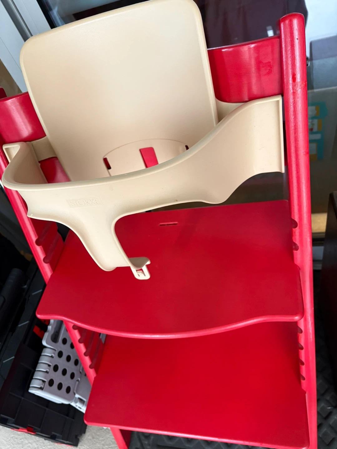 This Stokke Tripp Trapp high chair comes in red with a beige baby set. It includes the harness and cushions. Red wooden frame and seats. Adjusts as your child grows!