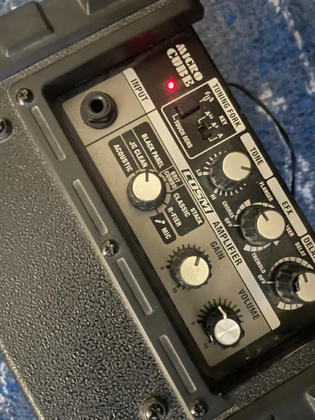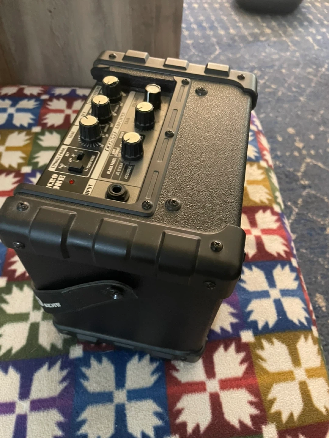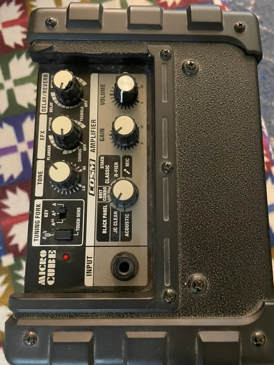 This small beast is battery operated or using 9 volt adapter, great for home rehearsals, street performances, small venue shows. The delay/ reverb dialing button is chipped a bit but it doesn’t affect the performance and the amp is in very good used condition.( please see pics)