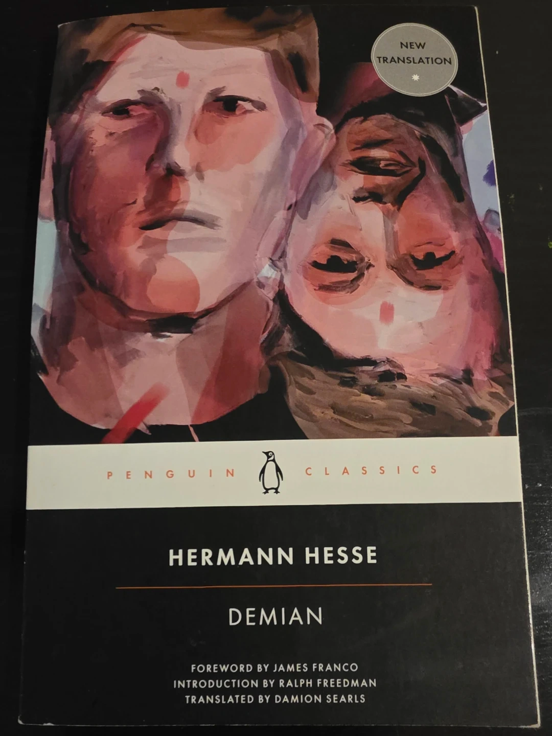 Selling a copy of Demian by Hermann Hesse, published by Penguin Classics. It's a new translation with a foreword by James Franco and an introduction by Ralph Freedman. The cover art is by James Franco and John Patrick Thomas. The price on the back cover is $22.00 CAN