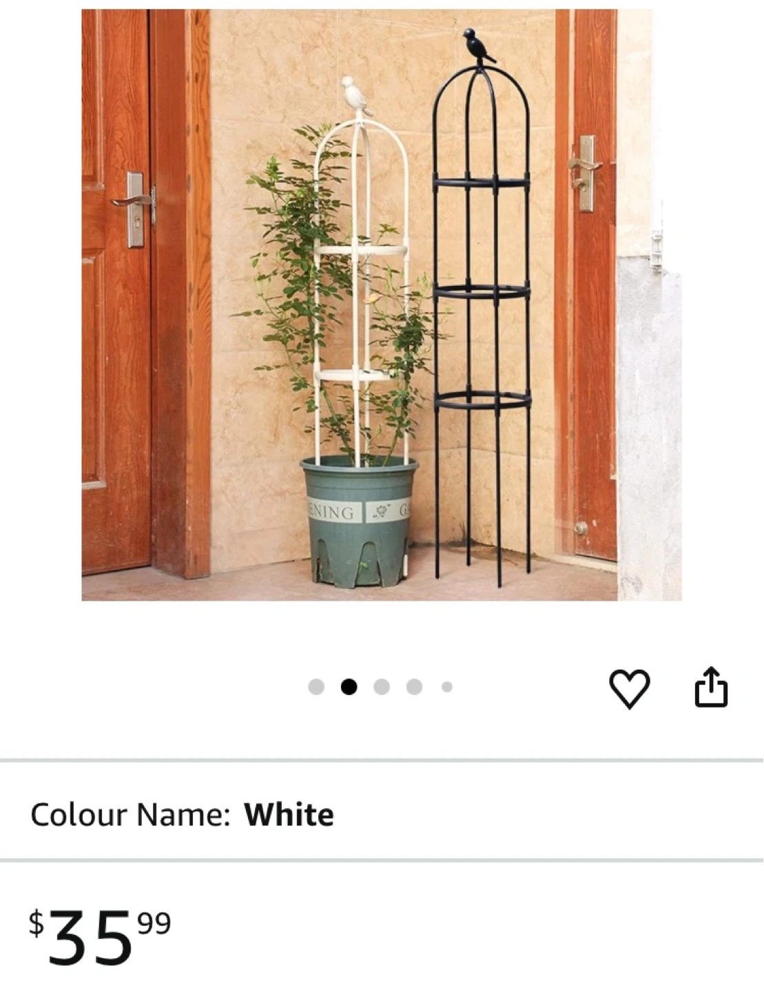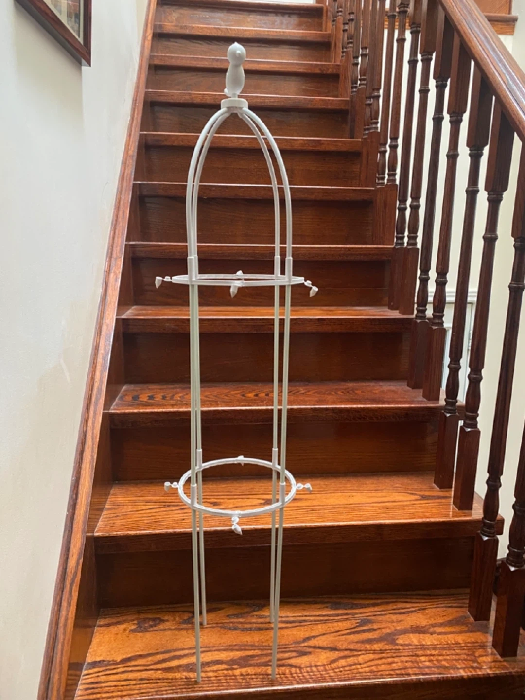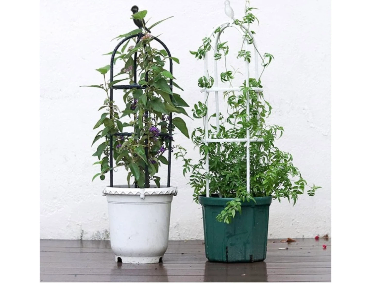 This white plastic garden trellis provides support for climbing plants. It's made of metal and includes stakes for stability. Great for your garden or patio!