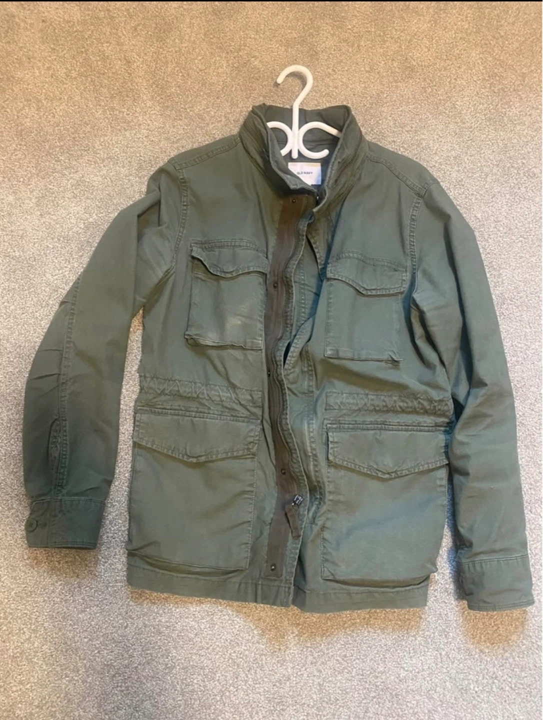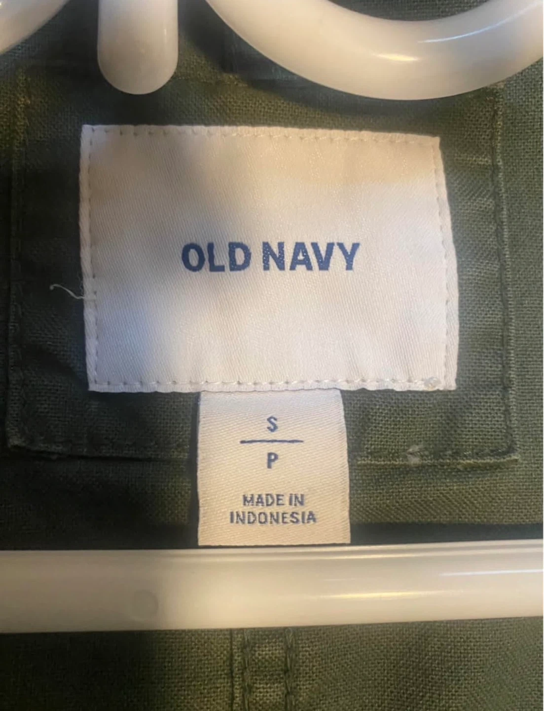 This is an Old Navy utility jacket. It's a size small and made in Indonesia. It's a classic green colour with multiple pockets.