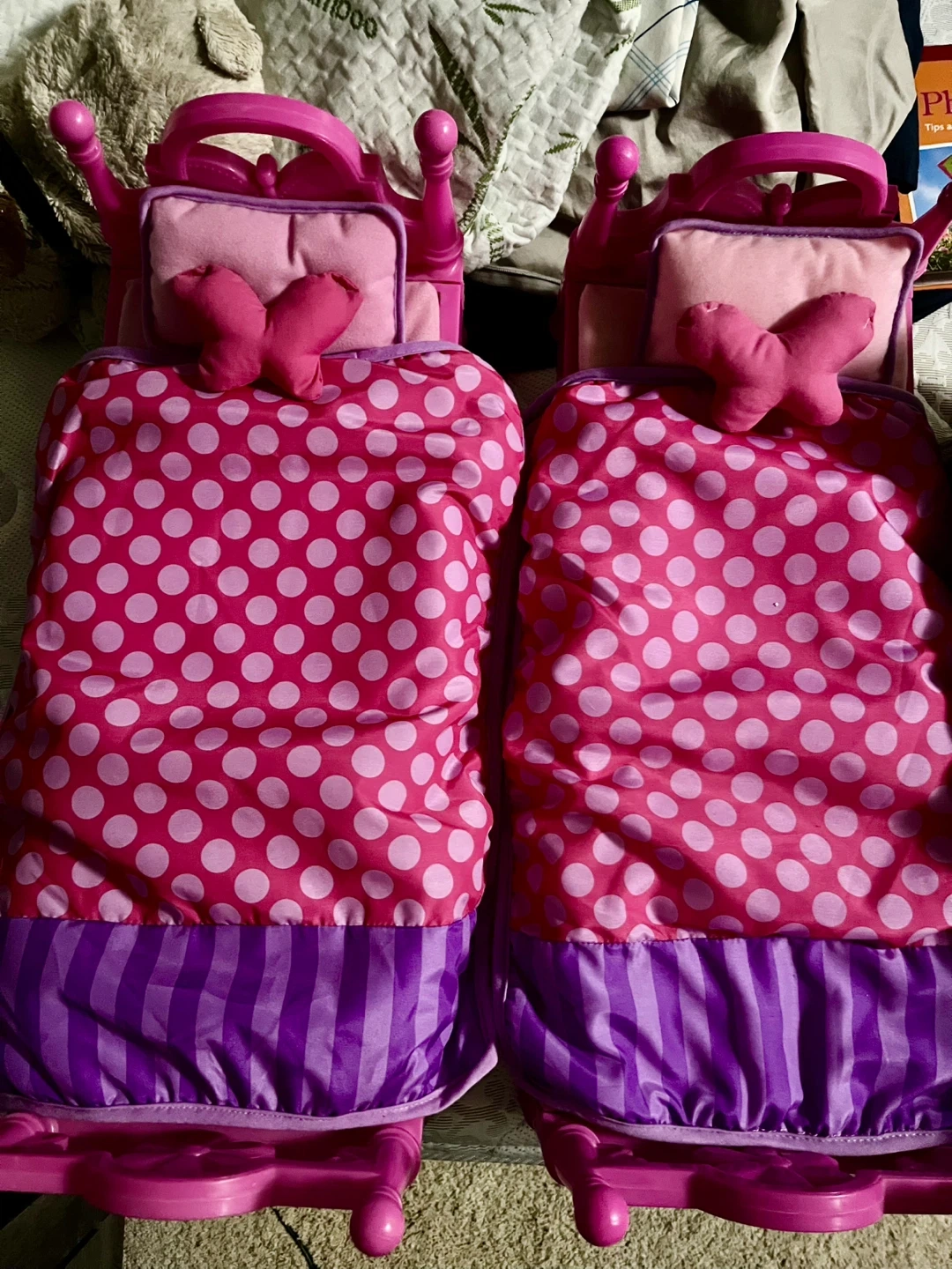 EACH doll is $120.00 and comes with one bed and 15 pieces of clothing and accessories to choose from.