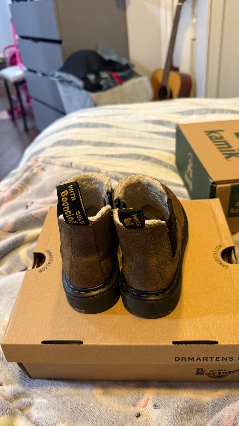 Dr. Martens 2976 Leonore J Chelsea boots in Dark Khaki suede. Core fur lined for warmth. Children's size UK 11 (EU 29, US 12). Includes original box.