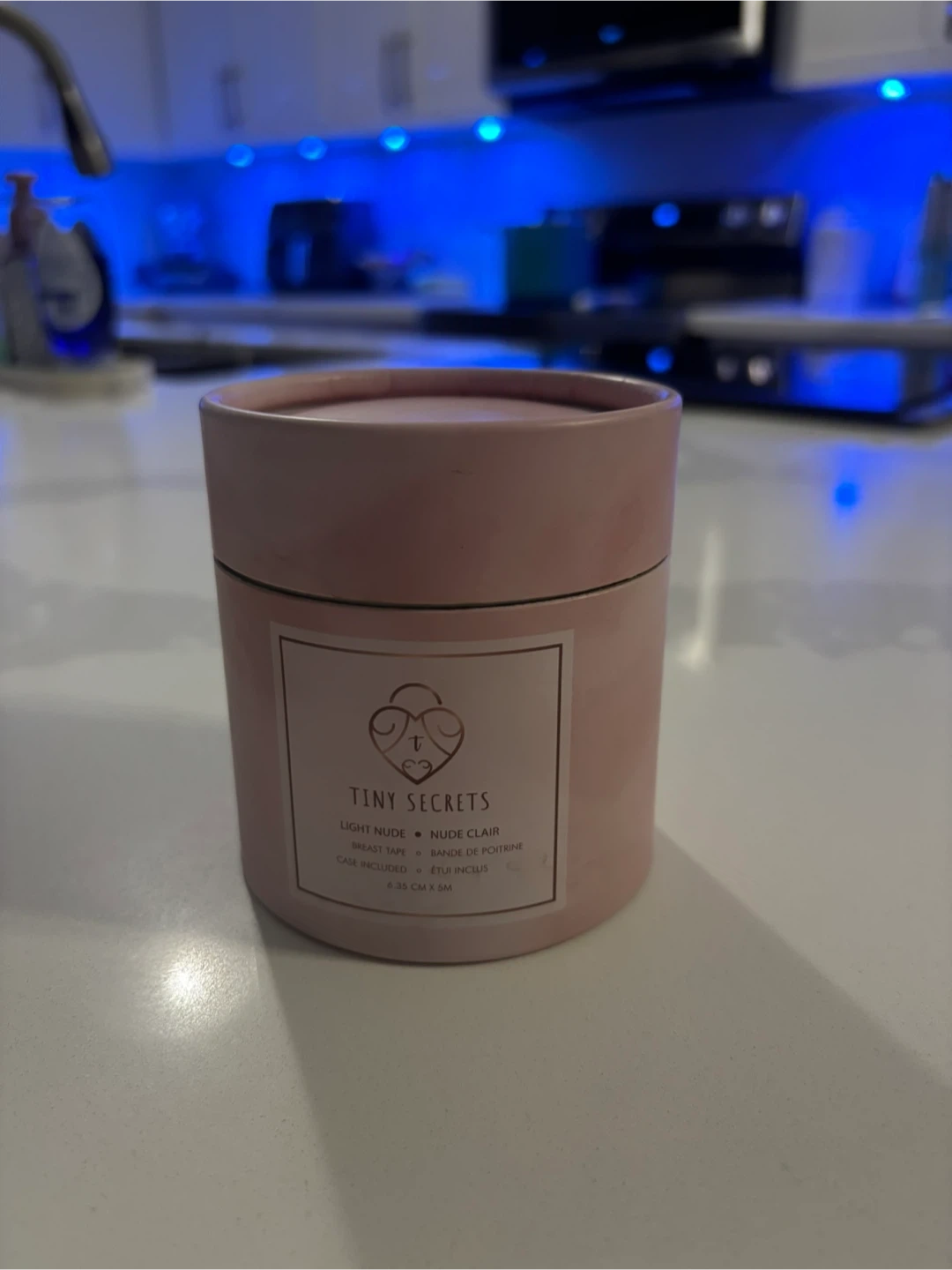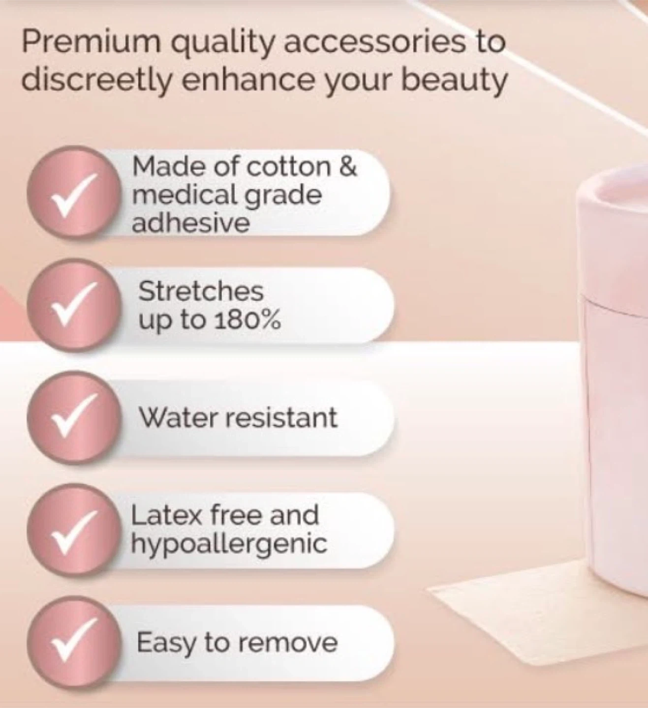 This Tiny Secrets breast tape is made of cotton and medical-grade adhesive. It's water-resistant, stretches up to 180%, and is latex-free and hypoallergenic. It's also easy to remove. This tape can be used in a variety of ways for support and shaping.
