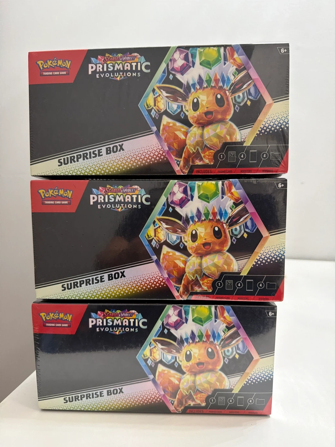 Get three sealed Pokemon Scarlet & Violet Prismatic Evolutions Surprise Boxes! Each box includes a promo card, boosters, and dividers. Perfect for any Pokemon TCG collector!