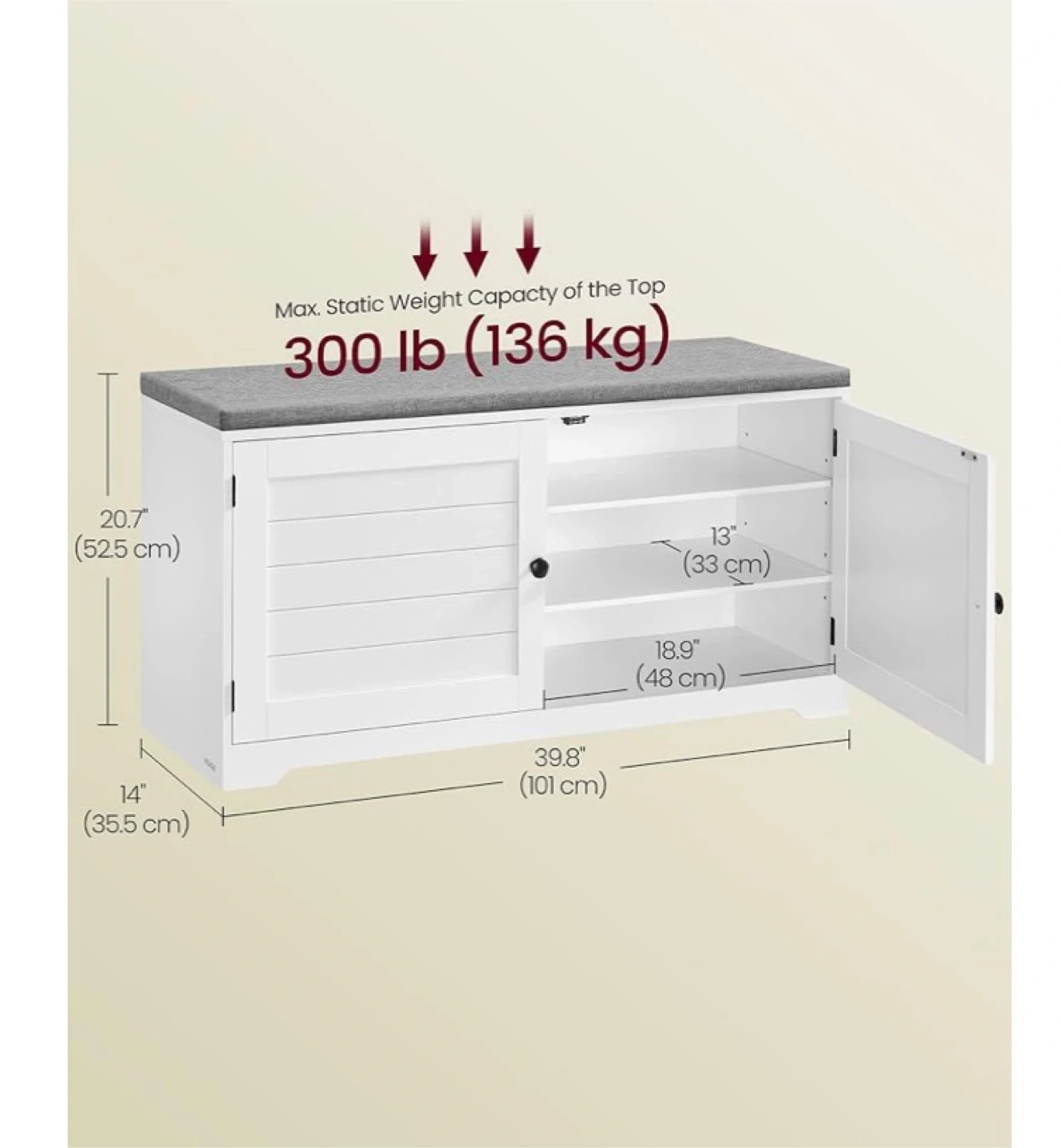 This white storage cabinet has two doors and a comfortable padded seat top. It's 39.8 inches wide and 20.7 inches tall. The top supports up to 300 lb (136 kg).
