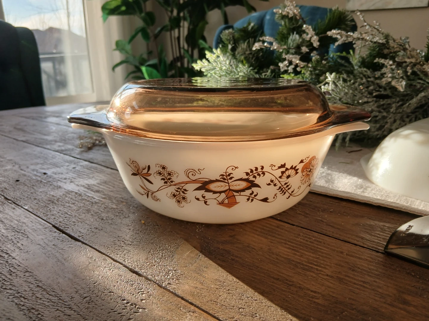 1970's Pyrex England Floral Vine 5PC Casserole Set with Smoky lids. EXCELLENT LIKE NEW CONDITION. This gorgeous collectible Bake set is HIGLY SAUGHT AFTER for retro kitchen decor. MCM Pick up Summerwood Subdivision Sherwood Park.