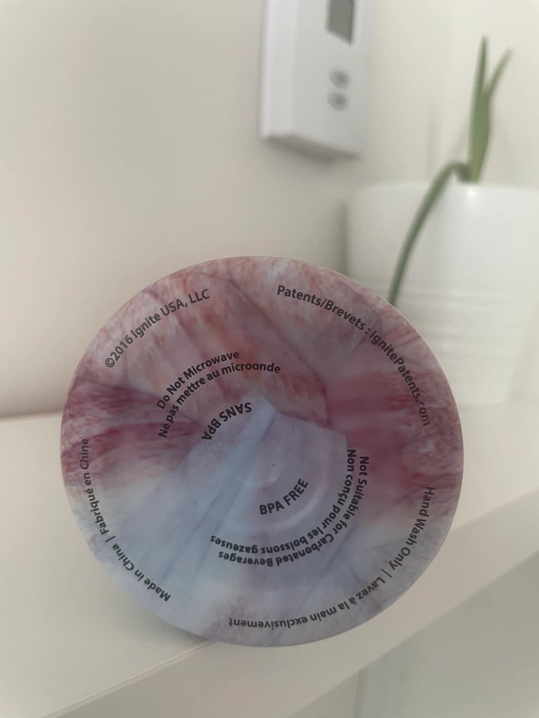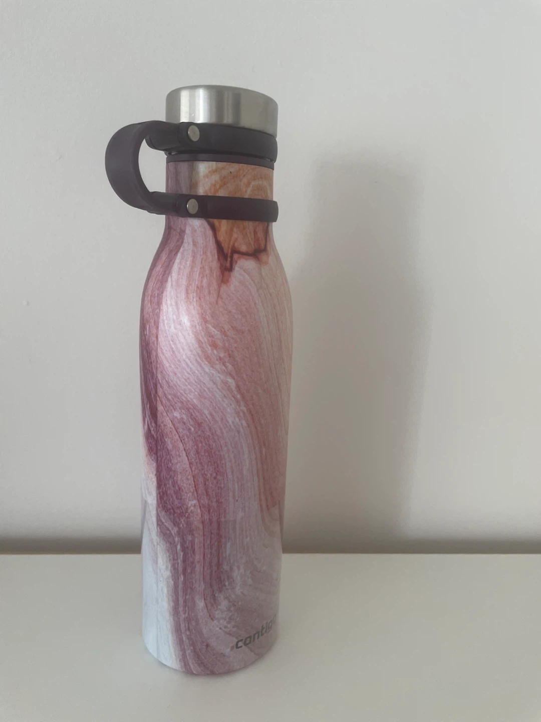 This Contigo water bottle features a stylish pink swirl design. It's BPA-free.