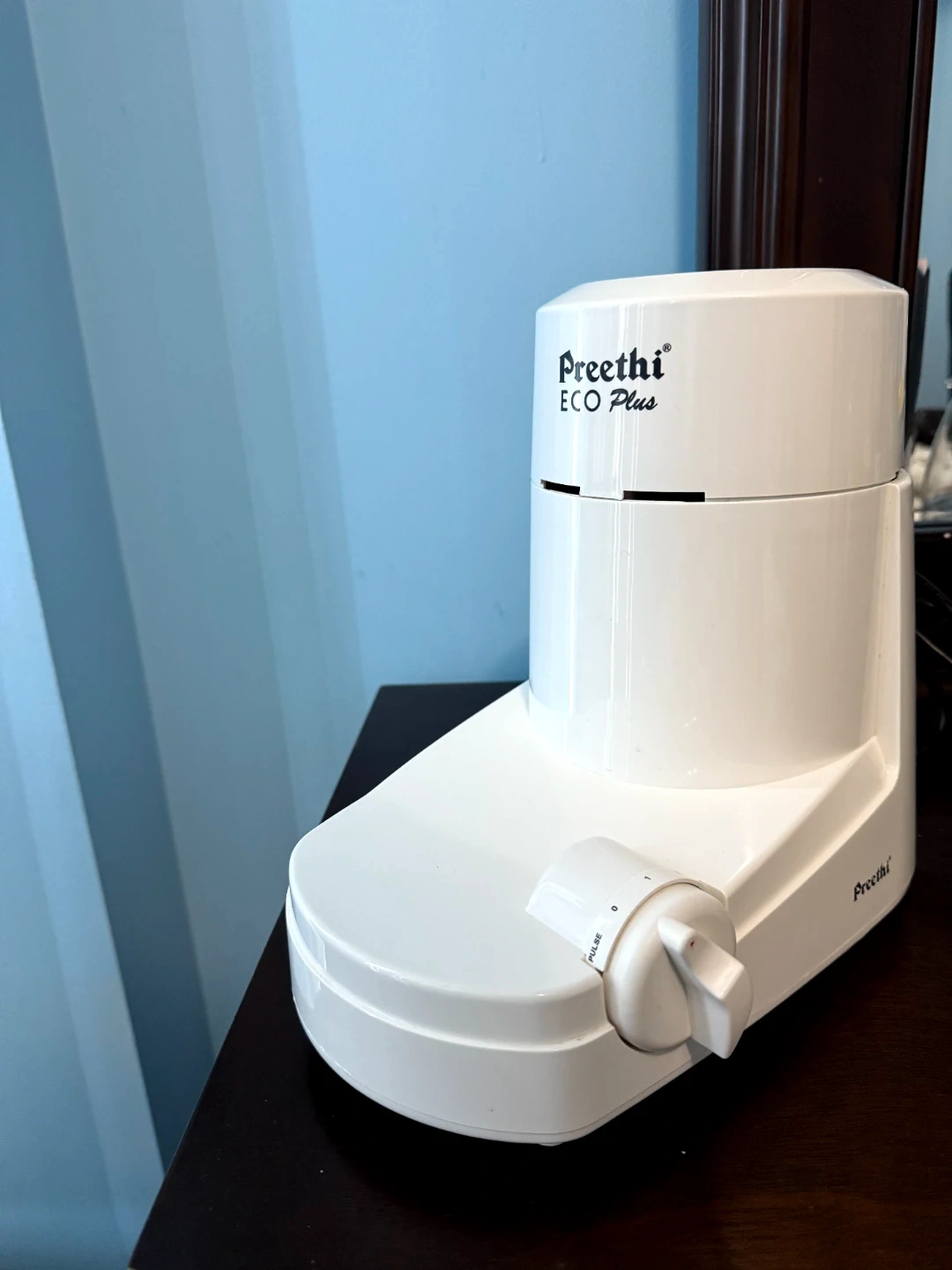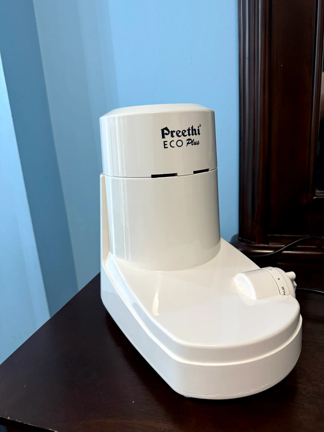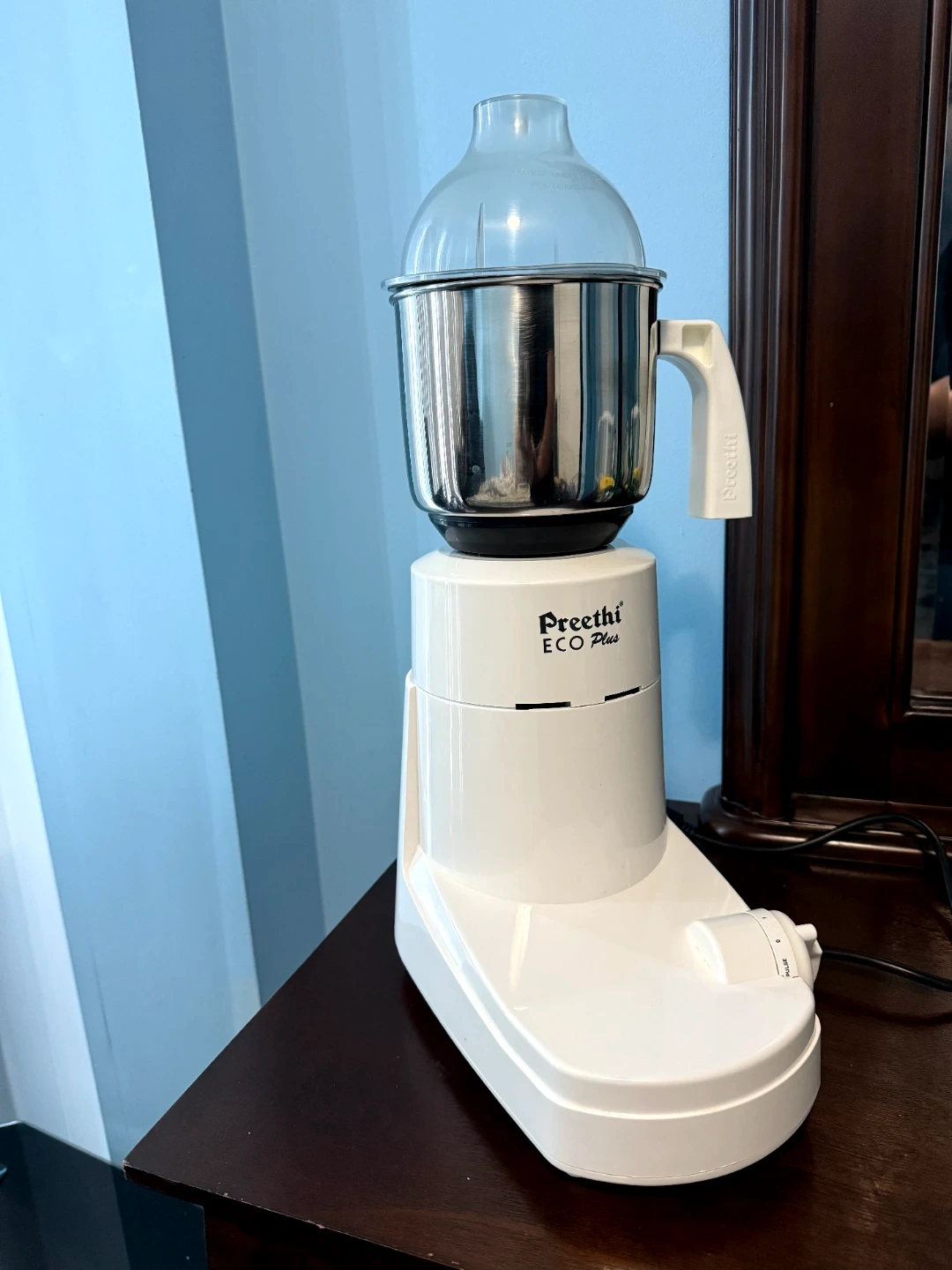 Preethi ECO Plus mixer grinder with a stainless steel jar. It features a pulse function for controlled blending. This appliance is great for everyday kitchen tasks. Used only a very few times as I opted for tiffin service.