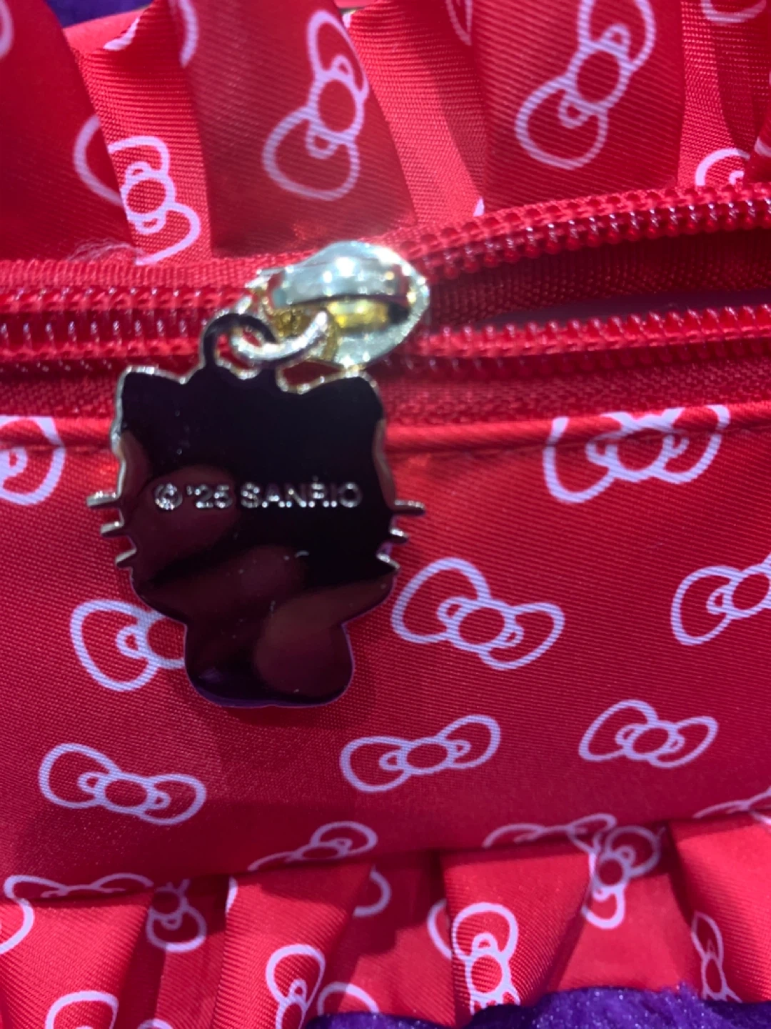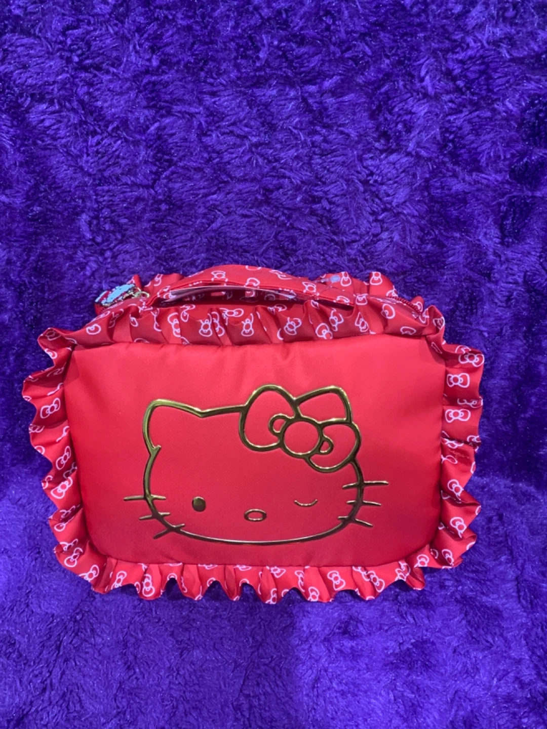 This is a cute red Hello Kitty cosmetic bag. It features a patterned exterior with bows and Hello Kitty graphics. The interior has multiple compartments and an elastic strap. The zipper pull has a Hello Kitty charm.
