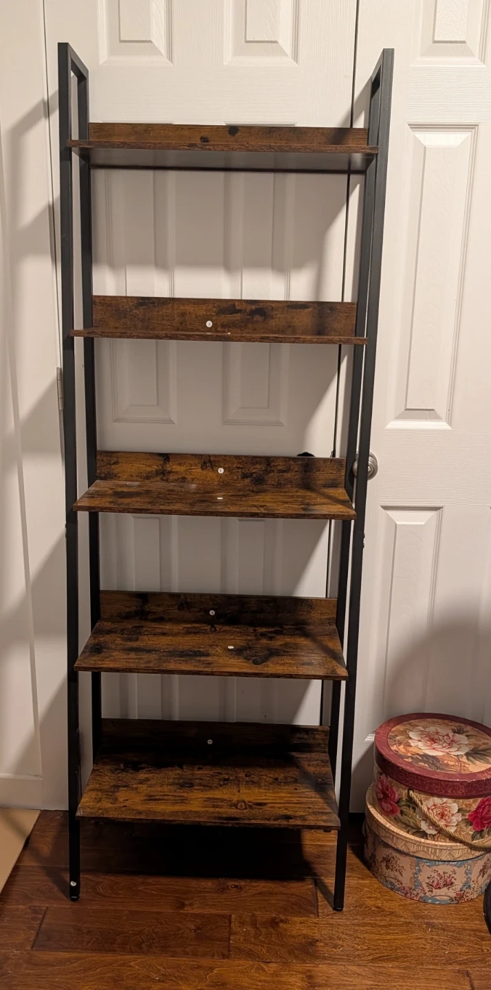 Ladder shelf with 5 tiers, perfect for books or decor. It has a rustic brown finish with a black metal frame. It's in great condition and ready to add some style to your home