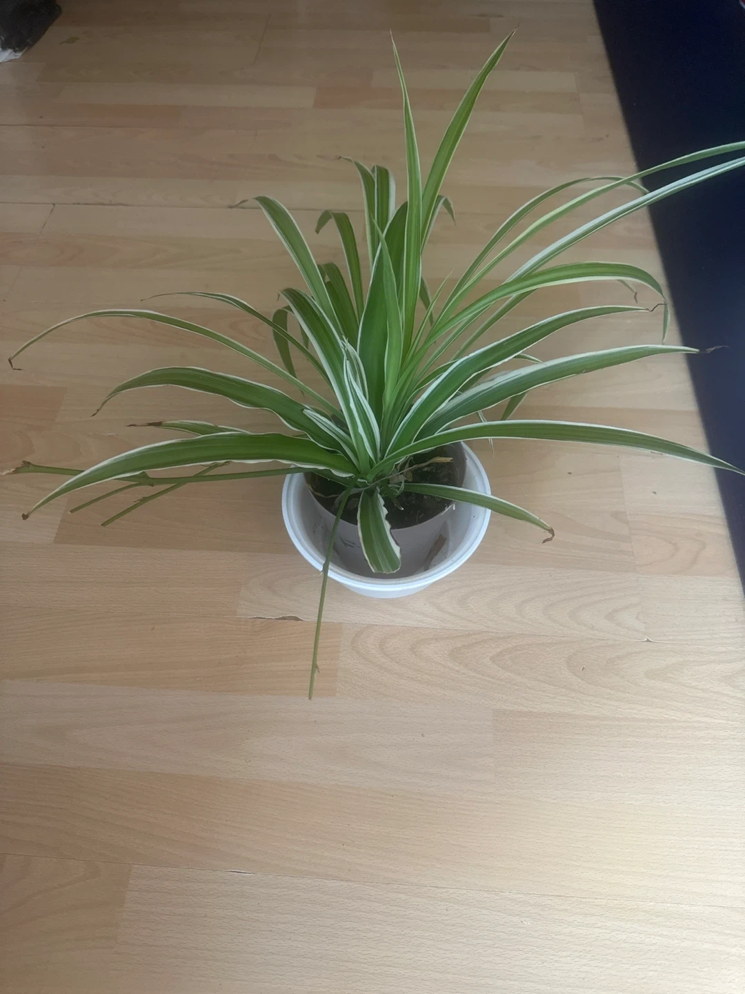 A healthy spider plant with characteristic green and white striped leaves. It's potted in a dark plastic pot with a white saucer. These plants are known for their air-purifying qualities. Great for bringing some greenery indoors!