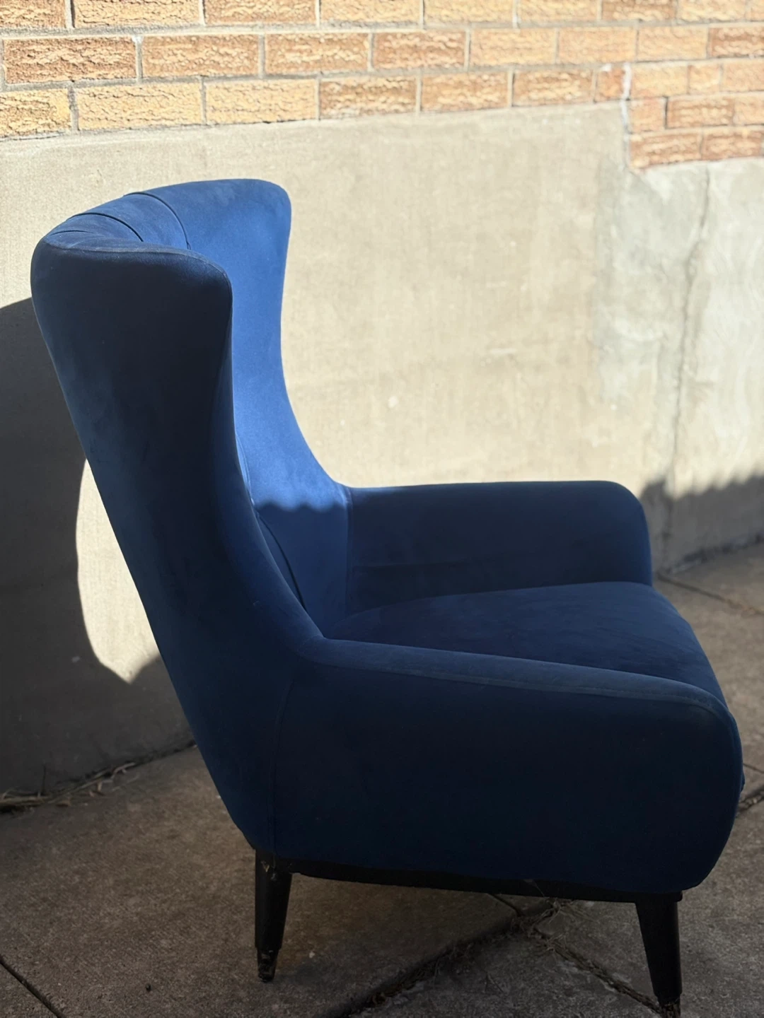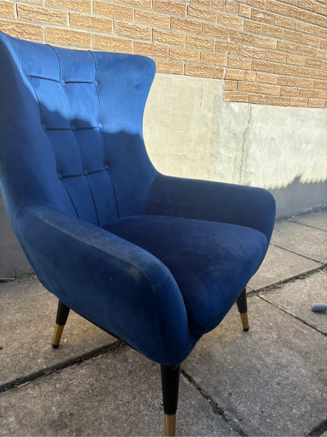 Stylish blue velvet accent chair with tufted back detailing. It features black tapered legs with gold accents. Upholstery is a soft velvet fabric.
