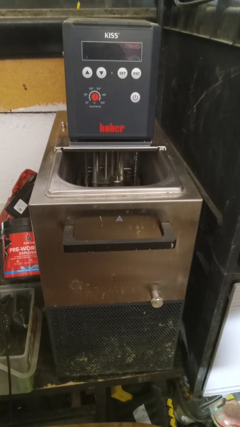 This is a Hüper KISS 5200 immersion circulator. It's a stainless steel unit with a digital control panel. Temperature settings are displayed on the screen.