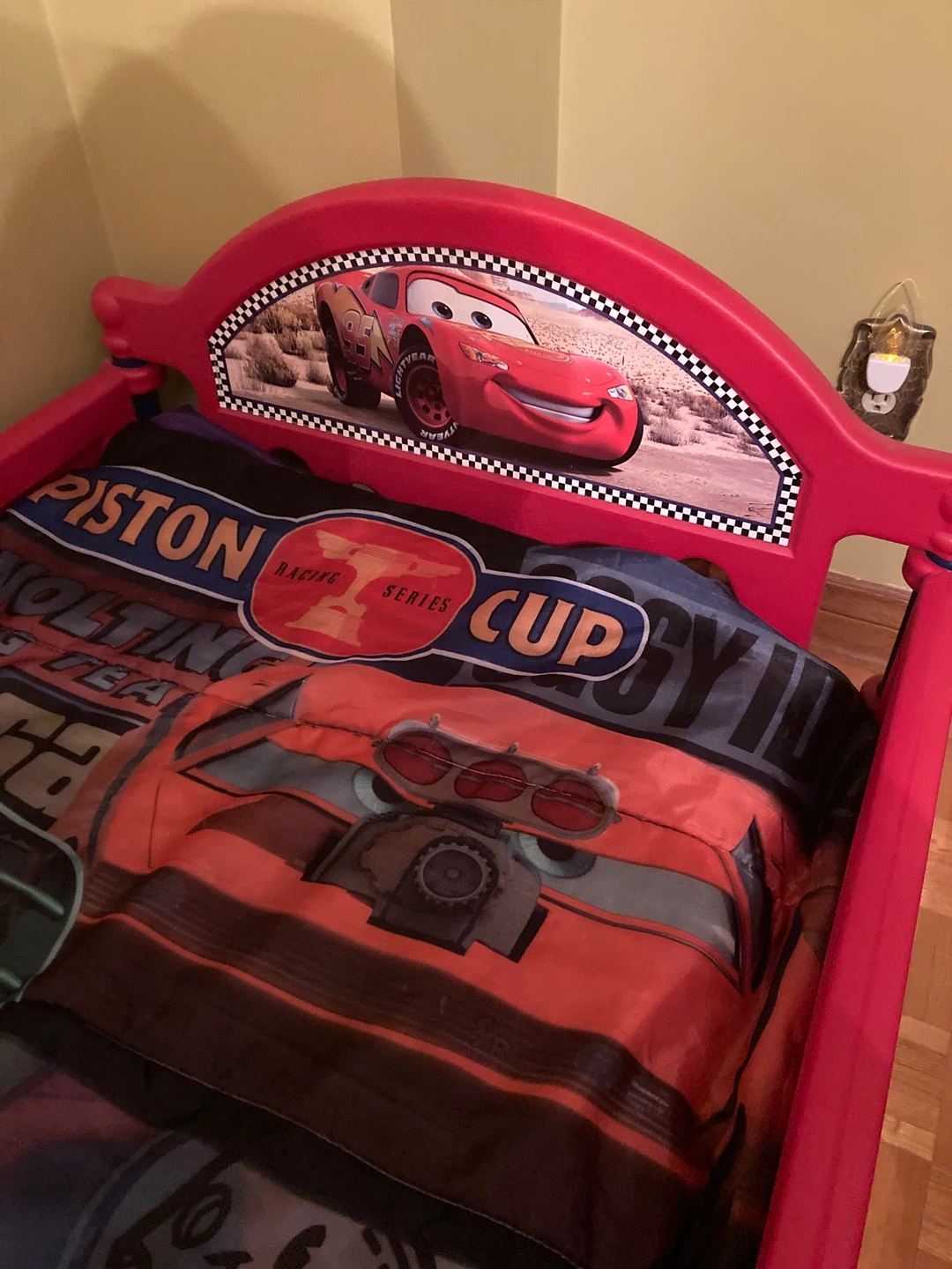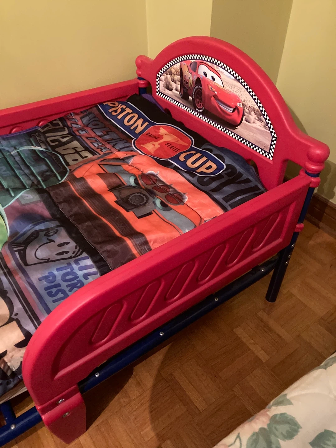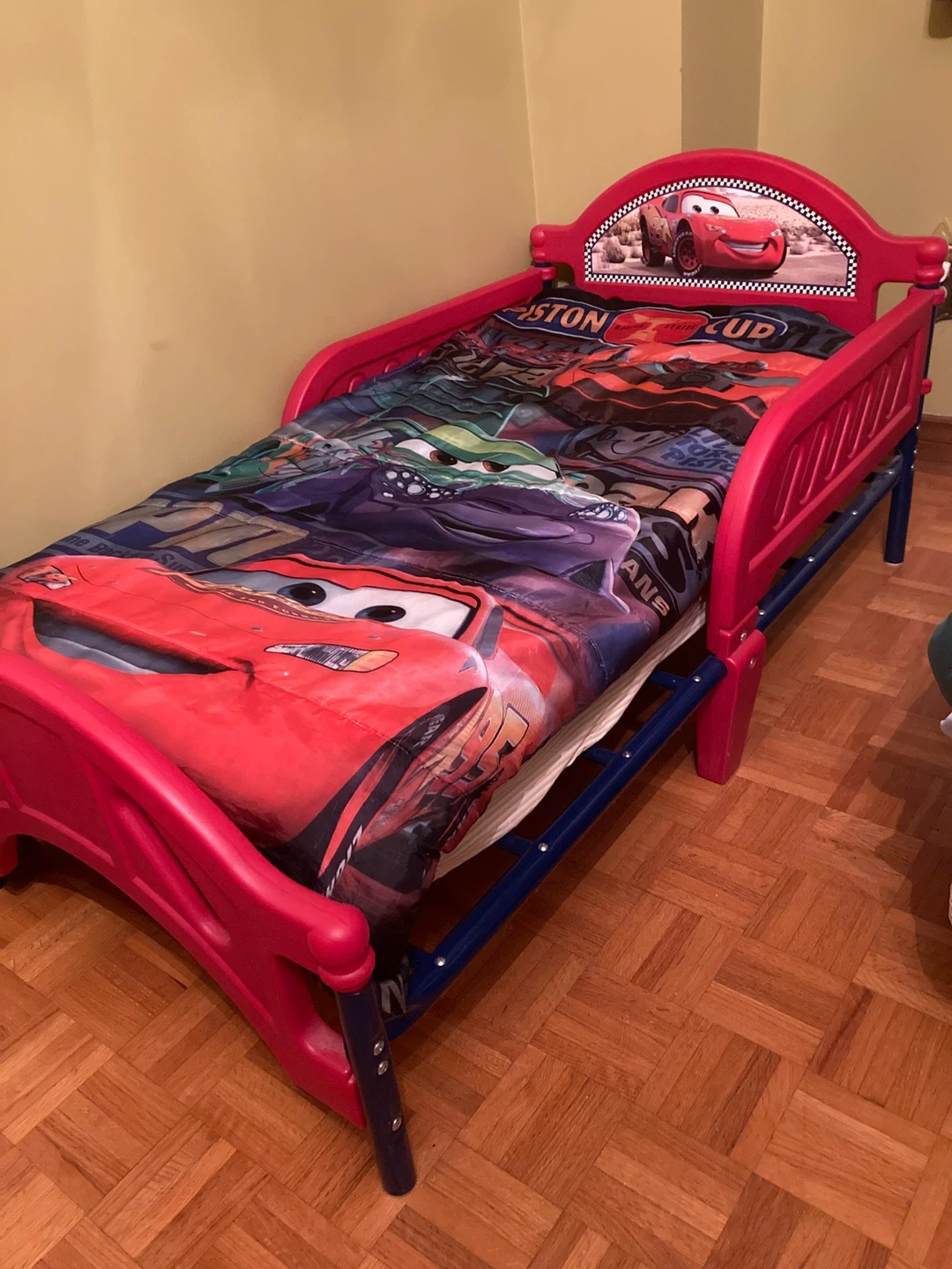 This bright red toddler bed frame features Lightning McQueen and other characters from Disney Pixar's Cars movie. It's a sturdy plastic frame with metal supports, perfect for little racers transitioning to their first "big kid" bed. The side rails help keep your child safe throughout the night!