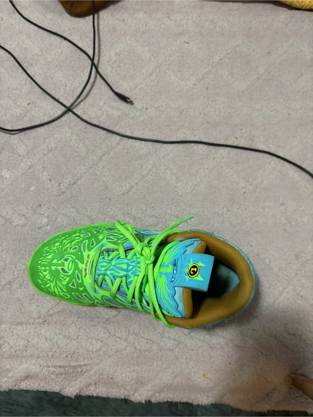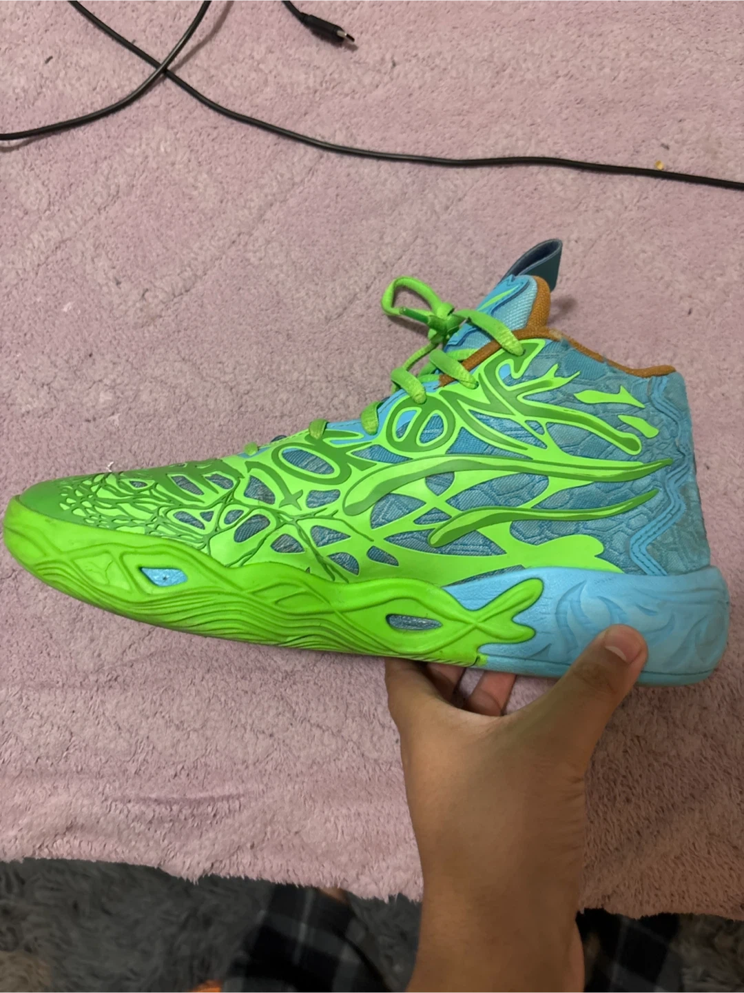 These Lemelo ball puma men's basketball shoes are designed for performance. They feature a vibrant green and blue colourway with an intricate, eye-catching pattern. The shoes offer excellent support and comfort for the court. Perfect for players looking for style and function! But it is kinda slippery but still has traction you just need a little grip spray and it is a little scuffed but it’s not noticeable