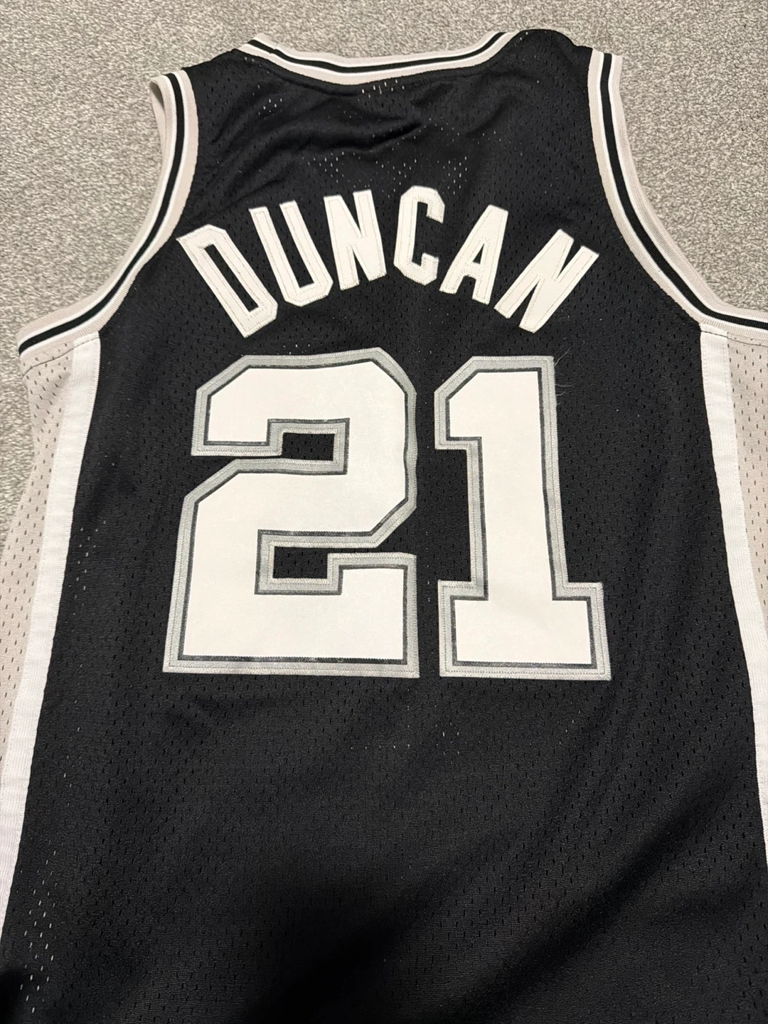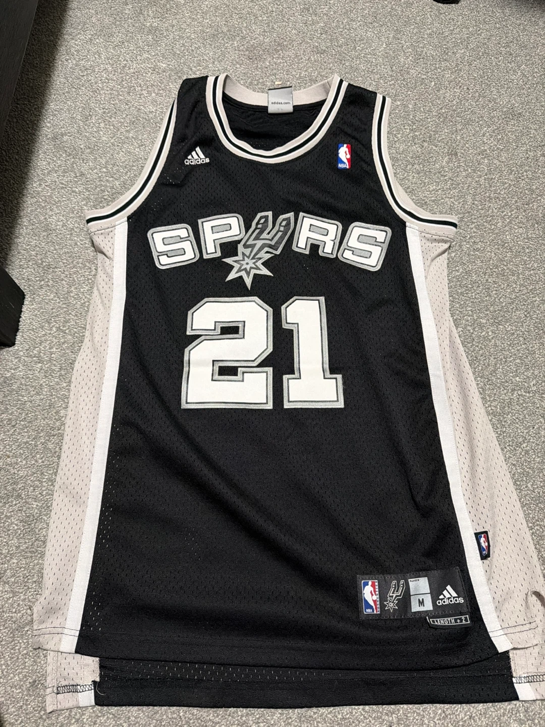 Adidas San Antonio Spurs jersey for Tim Duncan, number 21. It's a size medium. Breathable mesh material.