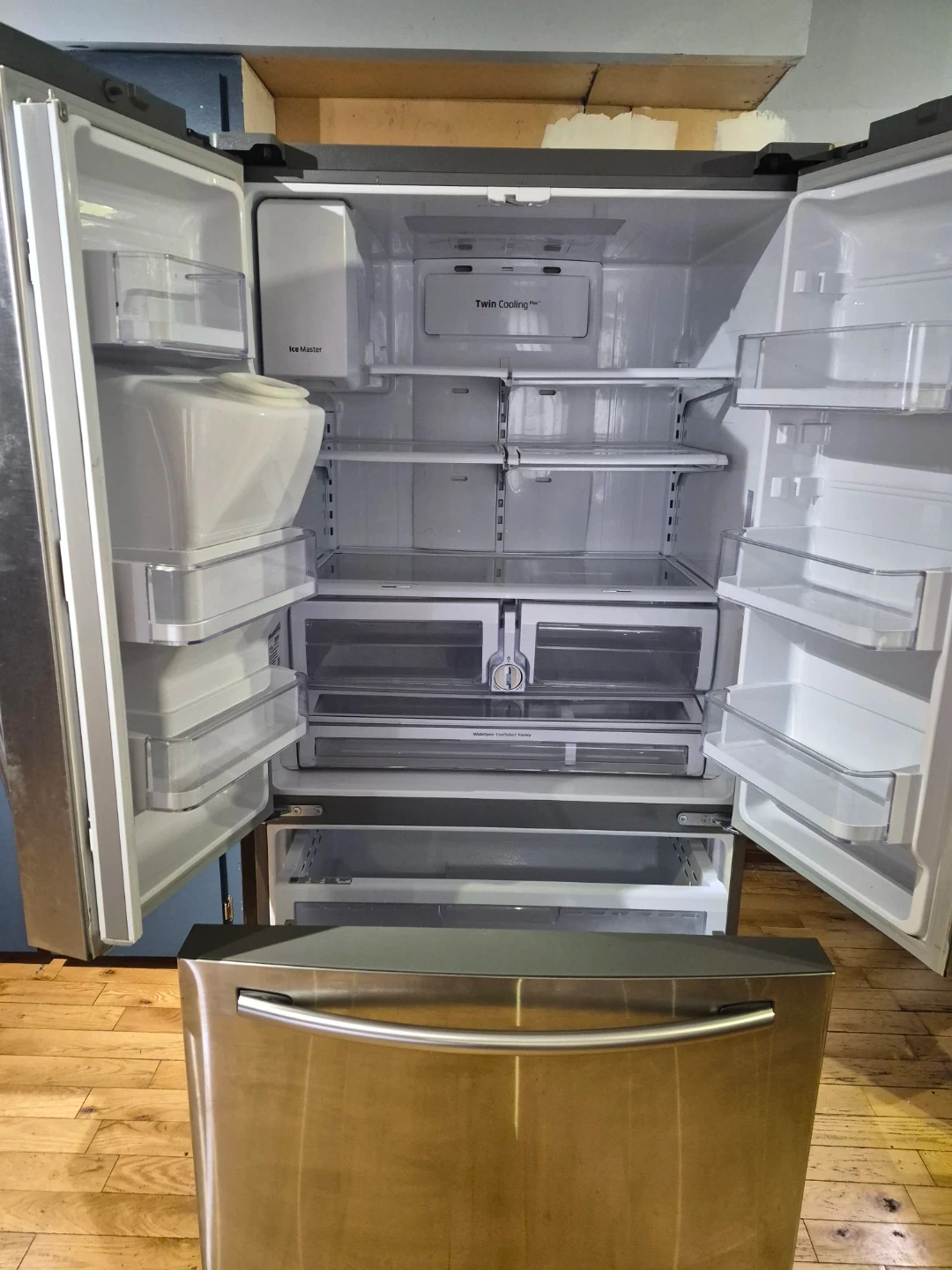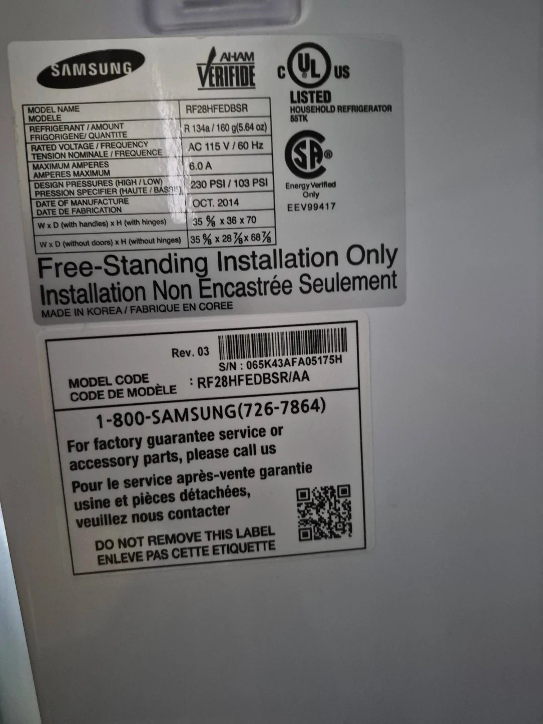 This Samsung French door refrigerator has a capacity of 28 cu ft and a stainless steel finish. It features a bottom freezer drawer and a water and ice dispenser. The unit's dimensions are 35" W x 28 ⅝" D x 70" H (without hinges). It was manufactured in October 2014.