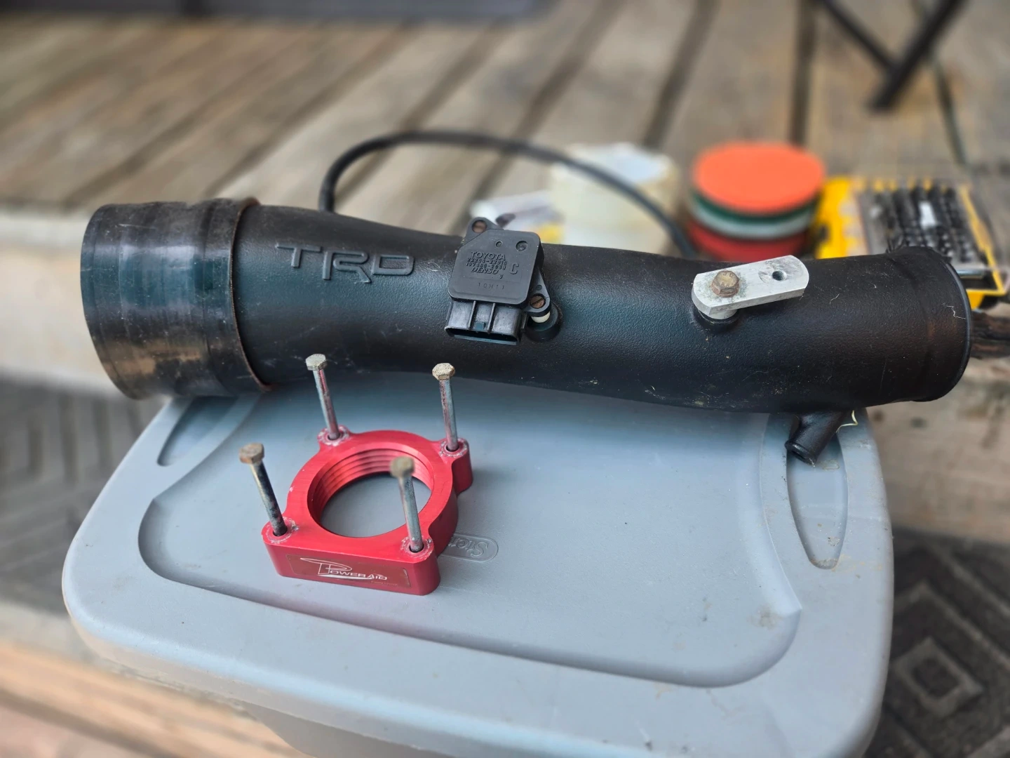 This is a TRD cold air intake tube. It includes a PowerAid throttle body spacer with hardware. The tube is black metal.
