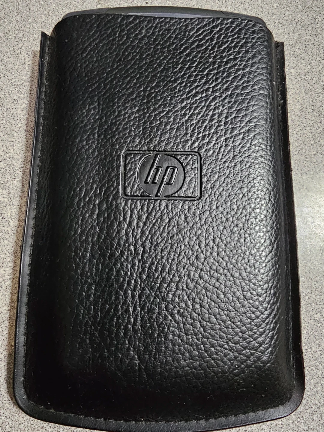 This is an HP 10bII business calculator. It comes with a protective black leather case. The calculator uses two CR2032 batteries.
