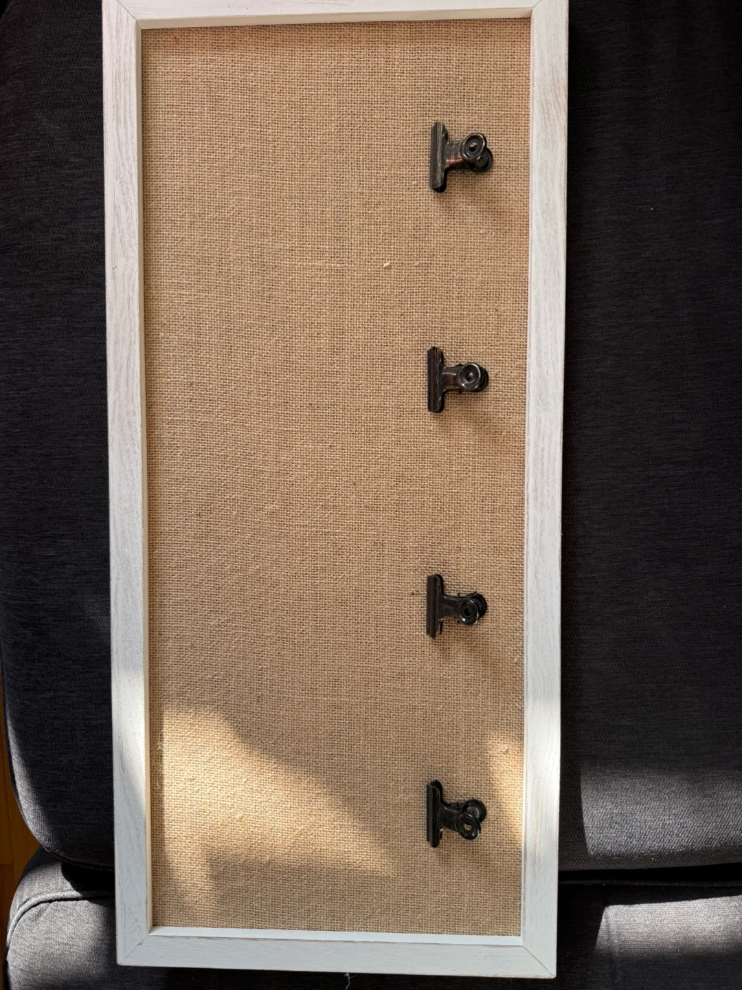 White wood-style frame with burlap backing and 4 metal clips. Display your favourite photos or mementos. This frame is ready to be hung on your wall!