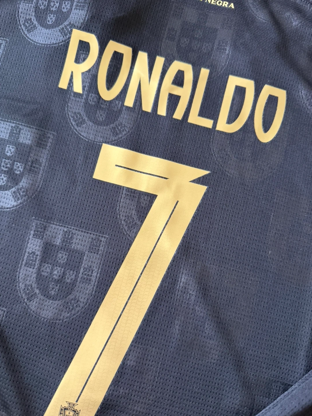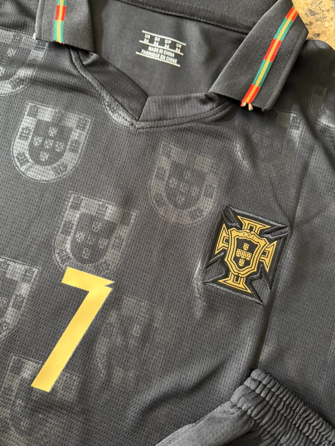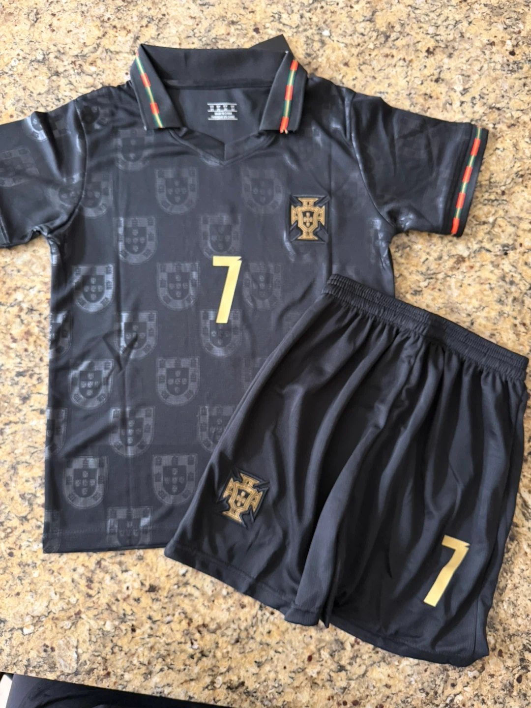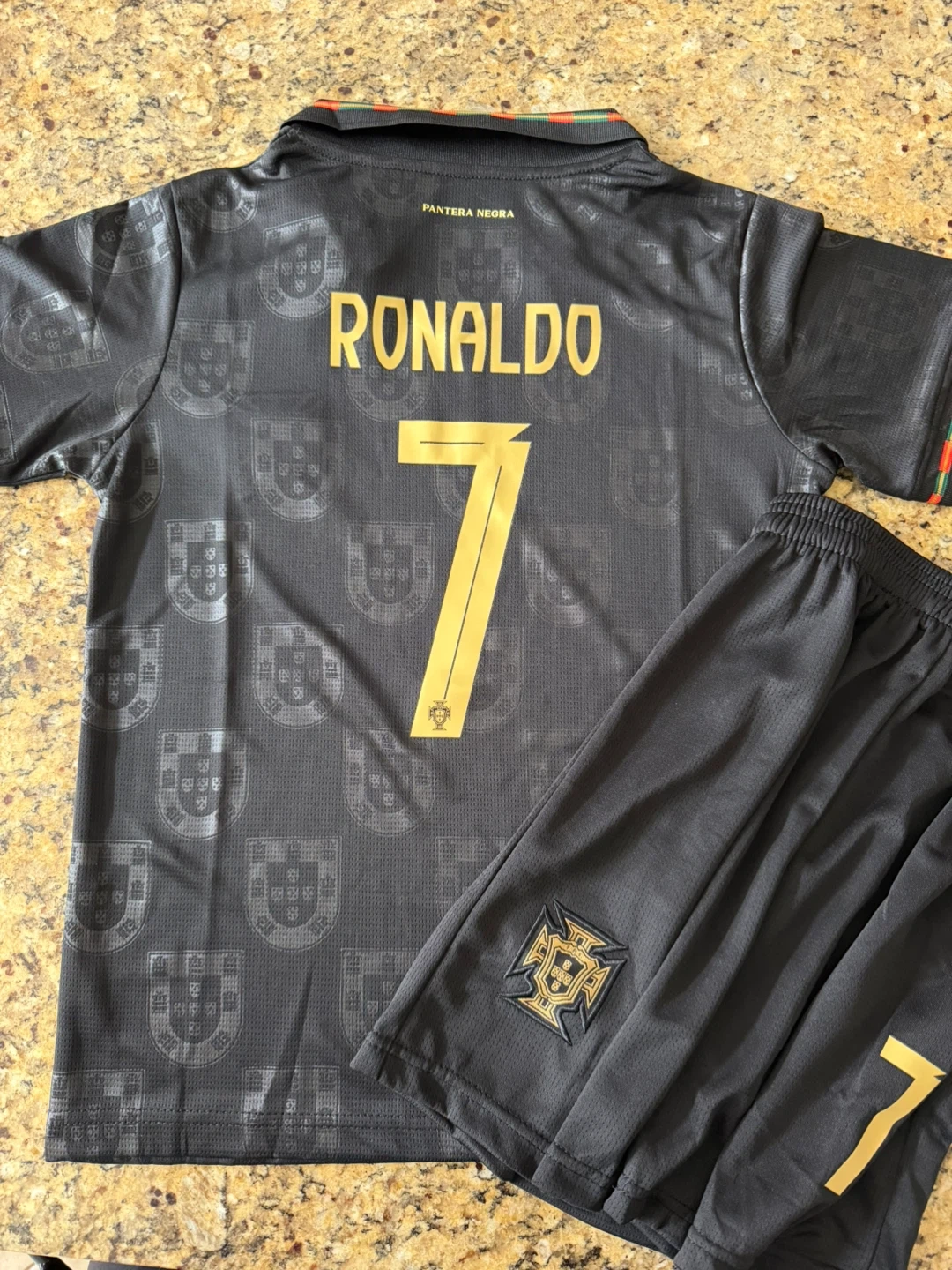 This is a Portugal national football team jersey and shorts set featuring Cristiano Ronaldo's name and number 7.