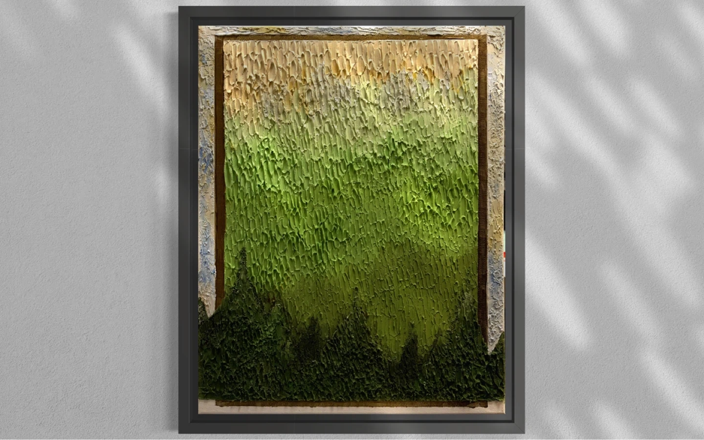 Framed textured painting with shades of green and yellow. It depicts a forest scene with a textured sky and dense trees at the bottom. The art piece is framed and ready to hang.